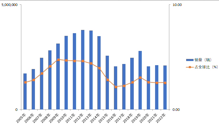 2005-2022年哈萨克斯坦历年汽车销量走势图
