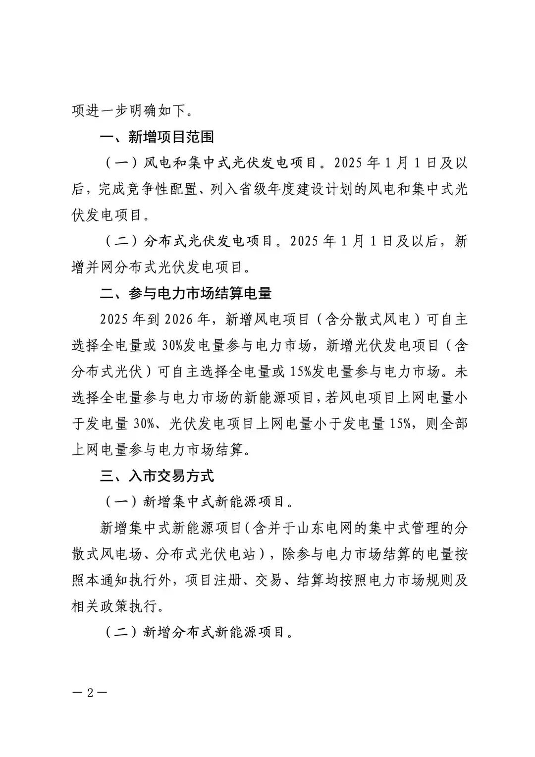 新增集中式新能源项目(含并于山东电网的集中式管理的分散式风电场、分布式光伏电站),除参与电力市场结算的电量按照本通知执行外,项目注册、交易、结算均按照电力市场规则及相关政策执行。