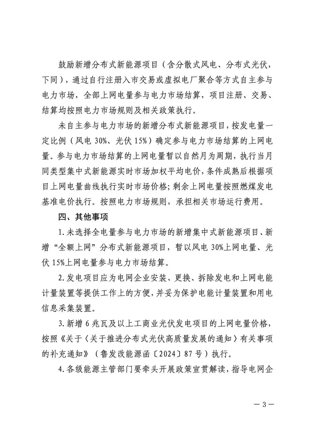 3.新增6兆瓦及以上工商业光伏发电项目的上网电量价格,按照《关于〈关于推进分布式光伏高质量发展的通知〉有关事项的补充通知》(鲁发改能源函〔2024]87号)执行。