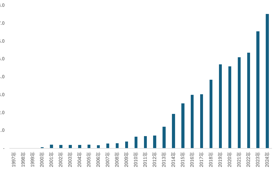 全球各国风电:1997-2024年摩洛哥历年风电发电量规模走势