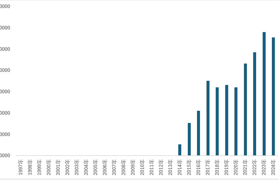 全球各国风电:1997-2024年南非历年风电发电量规模走势