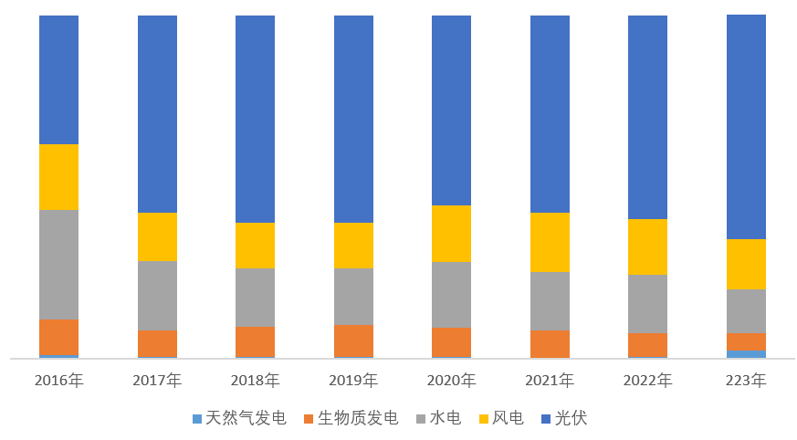 2016-2023年安徽省历年清洁能源发电装机容量结构(气电+水电+风电+光伏发电+生物质发电)