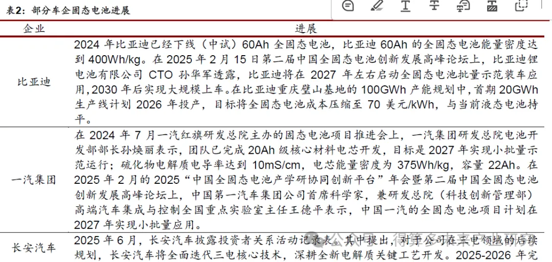 半固态锂电池已实现量产和小规模装车应用。发展固态锂电池是当前电池技术领域的一个重要趋势,旨在突破现有液态锂电池在安全性、能量密度和寿命等方面的瓶颈。固态锂电池根据电解质的固化程度可分为半固态和全固态两大类。半固态锂电池与现有液态锂电池的产线兼容度较高,目前在我国发展较快。卫蓝新能源、清陶能源等专注于固态电池的国内企业已经率先实现半固态电池的量产,并且小部分车型已实现半固态电池的装车应用。 全固态电池有望在2027 年左右开始装车。从车企端的最新进展上看,国内的比亚迪、一汽集团、长安汽车、上汽集团和广汽集团等车企研发进度较快,目前公布的数据显示全固态电池能量密度达到350-400Wh/kg。国内车企计划在2026-2027 年左右进行小批量装车应用。据央视网报道,2025 年2 月25 日中国电动汽车百人会相关负责人表示,在新能源汽车领域,预计到2027 年全固态电池开始装车,预计到2030 年可以实现量产化应用。 在新能源汽车、储能等领域带动下,全球锂电池需求强劲。新能源汽车方面,2024年欧美新能源汽车市场在经济疲软和高利率等因素影响下表现一般,但中国““以旧换新”政策刺激了国内新能源汽车需求,2024 年全球汽车动力电池出货量同比增长21.5%。储能方面,2024 年中国新能源强配政策叠加储能成本不断下探,带动储能电池需求快速增长;同时,美国、英国、沙特、澳大利亚等国也有一定储能装机需求,2024 年全球储能电池出货量同比增长64.9%。消费电子领域,受到ICT行业替换需求和新技术驱动,以及电动两轮车用小动力电池带动,2024 年全球小型电池出货量同比增长9.6%。2024 年全球锂电池总出货量达到1545GWh,据EVTank 预测,2030 年全球锂电池出货量有望达到5127GWh。 2030 年全球固态电池出货量有望达到396GWh。固态电池渗透率方面,(1)新能源汽车对于安全性和续航里程的要求有望推动固态电池应用,随着装车规模提升和进一步降本,预计到2030 年固态电池在新能源汽车领域的渗透率将达到10%;(2)储能市场对电芯成本敏感度较高,仅部分非常注重安全性的场景使用固态电池,短期内需求量有限,预计2030 年固态电池在储能领域的渗透率或达到2%左右;“(3)数码消费电池由于体积限制,对于能量密度要求更高,叠加用户体验升级等因素,有望成为固态电池商业化落地的试验田,预计2030 年固态电池在消费电子领域的渗透率有望达到12%。我们预计2030 年全球固态电池出货量有望达到396GWh。