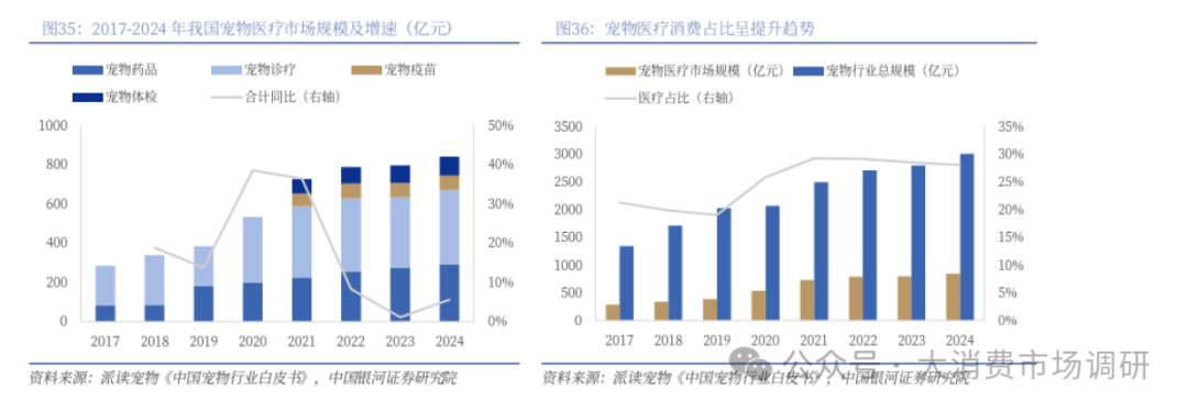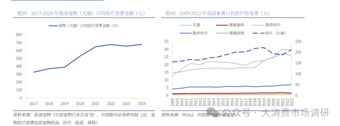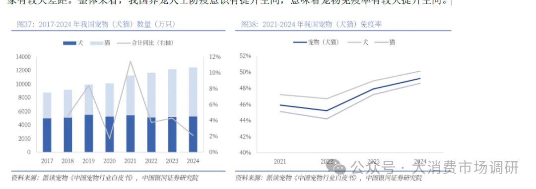 · 后续看我国宠物医疗市场未来增长空间,可以从量、价两方面拆分来看。 一方面,来自于量的提升,包括宠物数量的增加、免疫率提升等。从宠物绝对数量的增长来看,犬猫为我国主要的宠物饲养品种,2024年我国宠物犬猫数量合计1.24亿只,同比+2.1%,2017-2024年CAGR为+5.1%,呈稳定增长态势,其中宠物猫的增速高于宠物犬。但对标国外成熟市场,我国宠物渗透率仍有较大提升空间。根据尼尔森IQ,2022年我国宠物渗透率为22%,同期美国、澳大利亚、加拿大等成熟市场渗透率均超过50%,较日本28%的宠物渗透率亦尚存差距。 从免疫率提升的角度来看,近年我国宠物犬猫免疫率呈提升趋势,2024年宠物犬、猫免疫率分别达50.1%和48.6%。以狂犬疫苗为例,2024年我国宠物犬接种率达61.4%新高,自2019年起基本保持上行态势。根据WHO,一个地区的犬只狂犬病免疫率达到70%以上,就可以建立起有效的免疫屏障,切断狂犬病的传播。对比2017年美国宠物狗的狂犬病免疫率就已超过90%,我国宠物免疫率仍与发达国家有较大差距。整体来看,我国养宠人士防疫意识有提升空间,意味着宠物免疫率有较大提升空间。 另一方面,来自于医疗消费价格较高及其带来的盈利优势。从纵向变化来看,根据派读宠物白皮书,2024年我国宠物(犬猫)只均医疗消费额约677元,同比+3.4%,2017-2024年CAGR为+11%。随着宠物主对宠物健康重视度的日益提升,单只宠物医疗消费额呈现持续上行趋势,助力我国宠物医疗市场扩容。从横向对比来看,相比畜禽等经济动物,宠物诊疗费、疫苗及药品定价等均存在盈利优势。2022年我国主要经济动物中,只均医疗防疫费最高的奶牛为210元,其余畜禽只均医疗防疫费均在30元以下,而同期单只宠物年医疗消费676元,差距显著。宠物医疗消费的高定价带来毛利率优势,或将成为相关企业盈利增厚的新突破点。 作为宠物医疗的关键载体,我国宠物医院市场处于快速发展阶段。根据派读宠物白皮书,宠物诊疗(主要载体为宠物医院)是我国宠物医疗行业占比最高的子行业,2024年市场规模为378亿元,同比+5%,占比达45%。在宠物医疗行业产业链中,宠物医院处于核心枢纽位置,为宠物医疗服务发生的主要场所。相比美国等宠物医疗行业发展较为成熟的国家,我国宠物医疗行业起步较晚,在行业规模、渗透率、消费水平、规模化和专业程度等方面均存在较大差距,尚处于快速发展的阶段。 根据艾瑞咨询,我国宠物医院数量持续增长中,截至2024年8月,宠物医院数量已达30588家,较2022年10月增加14.2%。在医院数量增加的驱动下,我国宠物医院市场规模处于快速提升状态。根据Frost&Sullivan,2021年我国宠物医院市场规模达303亿元,同比+27.3%,2015-2021年CAGR为+21.8%,占宠物护理市场规模的比例自2015年的46.5%提升至2021年的55.6%,预计至2026年,我国宠物医院市场规模有望达789亿元。 我国宠物医院市场格局较为分散,龙头渠道优势显著。由于我国新开宠物医院的准入门槛相对较低,单体医院仍为主要形态。根据爱宠白皮书,2024年我国单体医院占比为78.9%;连锁化为我国宠物医院未来发展趋势,连锁医院占比自2021年的20.1%提升至2024年的21.1%。 根据前瞻产业研究院,从收入角度看,2022年我国宠物医院市场CR10为15.4%,CR2为11.8%(22年新瑞鹏、瑞派的宠物护理业务营收分别为29.6亿元和12.6亿元,市占率分别为8.3%和3.5%),集中度较低,市场格局较分散。其中新瑞鹏作为行业龙头,产业链覆盖最为完善,具有显著的渠道优势。在2024年我国宠物医院使用率Top10中,多数为新瑞鹏旗下宠物医院品牌。 23年以来宠物医院行业盈利承压,主要源自消费降级及成本端压力加剧。根据爱宠白皮书,23-24年宠物医院的量价两端均呈现下行趋势。一方面,23年以来日均客户数在10个以下的宠物诊疗机构占比明显增加,24年约八成以上的宠物诊疗机构日均客户数在20个以内;另一方面,平均客单价也有明显下降,24年绝大多数宠物诊疗机构的平均客单价在500元以下(占比约95.8%),而22年时平均客单价在500元以下的占比仅58%。 在量价双降的影响下,月营业额在20万元以下的宠物诊疗机构占比自22年的78.7%上升至24年的80.3%;利润率在10%以下的宠物诊疗机构占比自22年的55.6%上升至24年的70.4%,其中亏损的机构占比自22年的19.5%上升至24年的26.5%。24年我国宠物诊疗机构总体利润率水平约为-26.5%(同比-1pct)。行业正处于新一轮的洗牌调整中。 能够认为导致行业盈利下行的主要原因是消费降级及成本端压力加剧等。在宏观经济环境下的消费降级趋势影响下,宠物医疗消费的主力军中产阶级和GenZ年轻人收入受影响;同时由于宠物医疗多为自费项目,消费者与宠物医院之间关于定价的矛盾被放大。此外,宠物医院的各项成本呈增加趋势,压缩了企业利润空间。例如行业人才稀缺下的人力成本提高、政府监管趋严下的运营成本上升、高进口依赖度下的设备和药物成本上升,以及宠物医院数量增长下的引流成本增加等。在当前环境下,对宠物医院强化经营效率、优化成本结构提出了新要求。龙头公司在通过扩张获得规模优势的同时,也需注重可持续健康发展。 我国宠物疫苗市场稳步增长,占比较为稳定。根据派读宠物白皮书数据,宠物疫苗是宠物医疗行业第三大细分市场,2024年市场规模为75亿元,同比+3.3%,2021-2024年CAGR为+5%,尚有较大提升空间。宠物疫苗在宠物医疗行业总规模中的占比较为稳定,一般在9%左右波动,2024