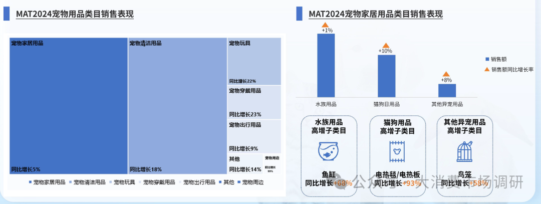 · 宠物用品越做越细,其中宠物家居、清洁用品占用品赛道80%份额,玩具、穿戴用品增长超20%,成为新兴的增长点.家居用品细分品类下,水族宠物用品占比高于猫狗,反映水族等小众宠物市场的潜力