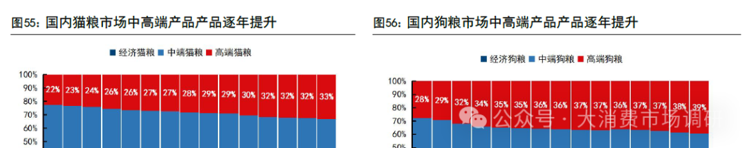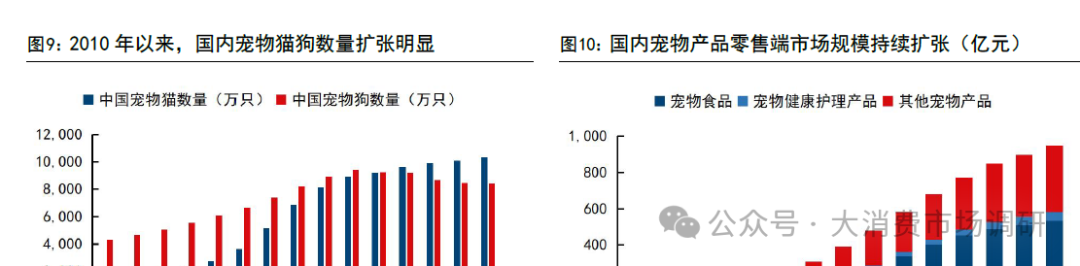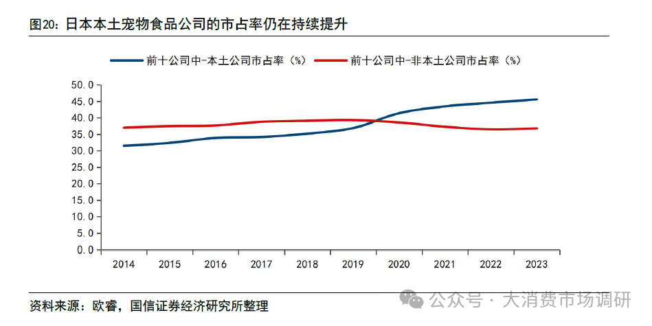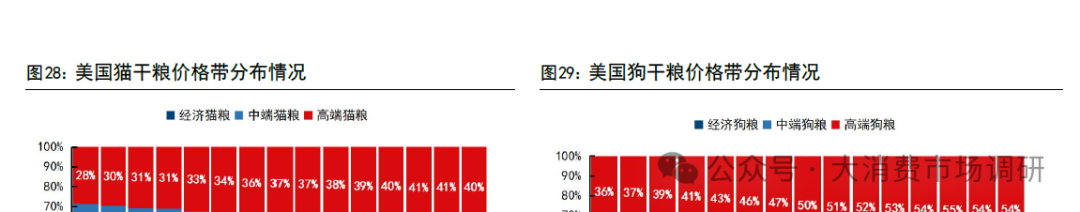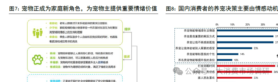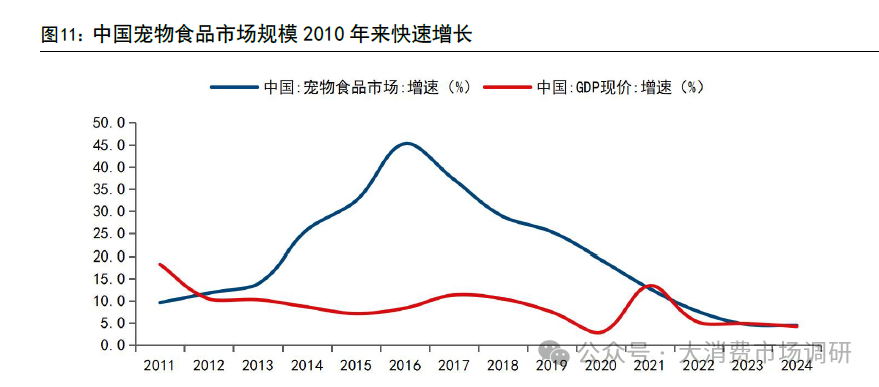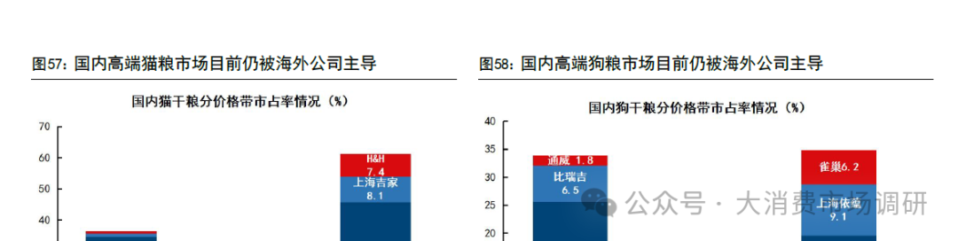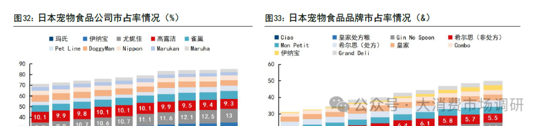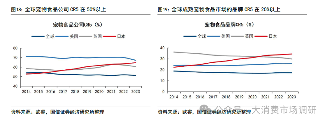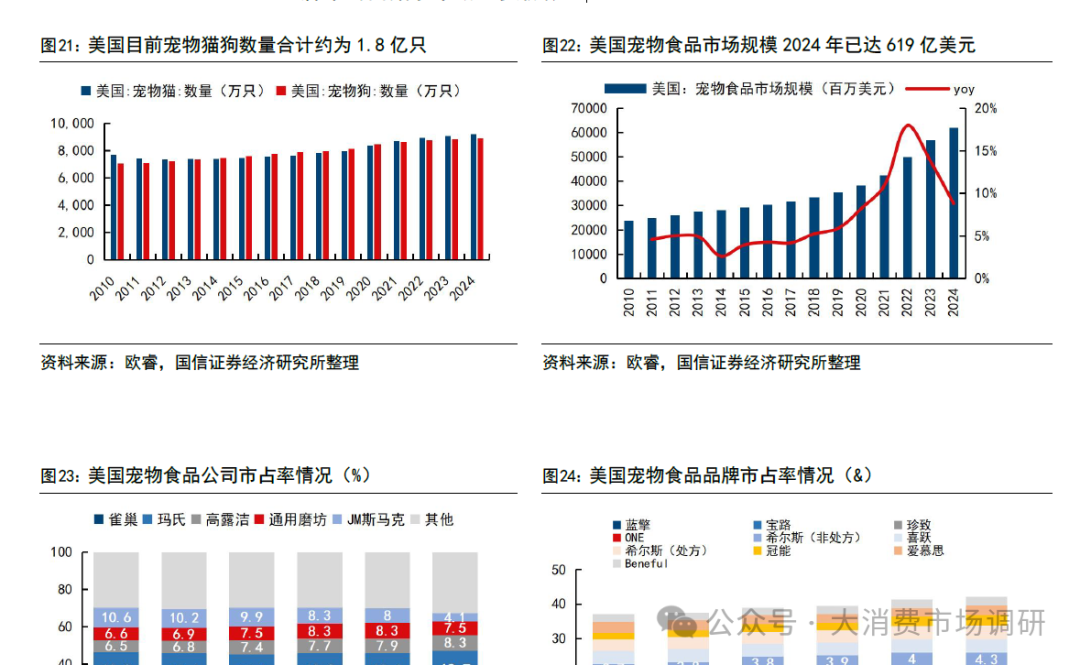 · 银发、单身经济兴起,情绪消费推动行业扩容 国内老龄、单身、少子化趋势明显 国内老龄化趋势未来10 年预计仍将加速受前期新生人口减少影响,国内老龄化趋势近年加速。截至2023 年,国内60 岁以上人口于总人口中的占比已突破20%。考虑到目前国内50-59 岁人口占比接近17%,是目前国内人口数量占比最大的年龄段,国内60 岁以上人口占比未来10年预计仍将保持增长趋势。在老龄化加速趋势中,国内老年人抚养比近年呈现加速攀升趋势,相应的抚养与陪伴需求正在为国内银发经济兴起提升基础。 国内单身化、少子化趋势明显。 据国家统计局统计,2024 年国内婚姻登记数为610.60 万对,较2023 年下滑20.52%,其中国内男性和女性的平均初婚年龄呈增长趋势,婚姻登记数近年则呈持续下滑趋势。除少婚晚婚外,目前国内家庭也呈现出少子化趋势,2024 年国内出生率为6.77%,较2023 年小幅回升,但整体仍呈下滑趋势。单身化、少子化趋势下,国内家庭结构正在发生变化,户均规模持续缩小,同样也在为基于寄托陪伴诉求的情绪消费兴起提供基础。 国内情绪消费兴起,宠物经济快速发展 自2010 年以来,受国内人均收入水平以及老龄单身少子化趋势等因素推动,宠物猫狗正从传统的看家护院角色转变为提供情绪价值的重要伙伴。参考欧睿统计口径,截至2024 年猫/狗饲养数量分别已达1.03/0.84 亿只,2014-2024 年CAGR 分别为14.17%/3.33%。而在宠物角色转变过程中,基于便利、健康等诉求,现代养宠方式及理念快速兴起,宠物经济随之快速发展。参考欧睿统计口径,截至2024年国内宠物产品市场规模已接近千亿元,其中宠物食品市场规模为532.52 亿元,2014-2024 年CAGR 高达21.01%。 参考海外成熟市场,宠物食品市场仍具较大扩容潜力 宠物食品消费刚性强,即使在经济下行时也具备增长韧性。 参考欧美成熟宠物市场,宠物作为重要家庭角色之一,即使短期出现经济和收入下行压力,宠物主也不会削减食品开支,宠物食品市场规模在过去十年呈现韧性增长特征。国内宠物食品市场规模增速近年持续放缓,但相较GDP 增速仍具备韧性,后续随宠物数量及单宠消费增长,仍有望保持扩张。 宠物猫食品:国内市场规模未来有望扩容至约1400 亿元。 国内宠物猫市场发展时间较短,2024 年国内宠物猫饲养渗透率仅为15%,明显低于欧美成熟市场。单宠消费方面,2024 年中国人均可支配收入为4.13 万元(按当年平均汇率计算,约为5728 美元),而美国、英国近年的人均可支配收入分别约为6 万美元、3 万美元,这导致我国单宠消费金额目前远不及美英平均水平。 数量方面,美英平均养猫渗透率约为30%,考虑到国内老龄少子单身趋势对养宠数量的带动,保守预计国内养猫渗透率未来增加至25%左右;单宠消费方面,假设未来中国人均可支配收入规模达到发达国家水平,保守估计中国单宠消费金额为美英平均水平的0.5x,即对应单宠消费金额约为830 元(主粮730 元,零食100元)。最终基于上述测算假设,我们预计国内宠物猫食品市场规模未来有望扩容至约1400 亿元(其中宠物猫主粮市场规模约为1200 亿元)。 宠物狗食品:国内市场规模未来有望扩容至约550 亿元 国内宠物狗渗透率及单宠消费同样仍处于较低水平。2024 年国内宠物狗饲养渗透率仅为16.50%,单宠消费仅为35.54 美元,不足美英平均水平的1/10,均处于较低水平。 数量方面,美英平均养狗渗透率高达36%,但考虑到国内人均居住面积低于欧美国家,宠物狗数量未来增长潜力预计明显小于宠物猫,故保守预计国内养狗渗透率为20%左右;单宠消费方面,同样受限于人均居住面积,国内小型犬饲养占比明显高于欧美国家,因此保守估计中国单宠消费金额为美英平均水平的0.20x,即大约540 元/只(主粮390 元,零食150 元)。最终基于上述测算假设,我们预计国内宠物狗食品市场规模未来有望扩容至约550 亿元。 综合来看,未来随国内养宠数量增加、单宠消费提升,宠物猫狗食品市场规模有望扩容之2000 亿元左右,较2024 年市场规模仍较大潜力。 海外宠食行业复盘:先驱品牌壁垒坚固,后发品牌差异竞争 总览:海外宠食市场格局集中,本土品牌占据重要份额 海外宠物食品市场格局高度集中。 按公司口径来看,2019-2023 年全球宠物食品市场平均CR5 为51.5%,其中美国/英国/日本宠物食品市场平均CR5 分别为69.4%/60.6%/62.6%;按品牌口径来看,2019-2023 年全球宠物食品市场平均CR5 为17.00%,其中美国/英国/日本宠物食品市场平均CR5 分别为25.1%/31.5%/32.4%。 趋势上来看,欧美市场格局较为稳固,而日本市场的本土品牌仍在抢占市场。 美国、英国作为现代宠物食品工业发展时间最早的成熟市场,头部公司依靠在供应链、研发、品牌、渠道等方面的深厚积淀以及持续的并购整合稳定占有当地市场主要份额。而日本的现代宠物食品市场相对起步较晚,早期市场由海外公司及品牌主导,进入21 世纪以来国内本土品牌崛起,目前本土头部公司及品牌的市占率仍在持续提升。 美国复盘:龙头基于研发背书、多品牌布局强化市场站位 美国宠物食品市场呈“两超多强”格局,雀巢、玛氏合计市占率接近50%。 美国作为全球最大的宠物食品市场,2024 年国内宠物猫狗数量已达1.8 亿只以上,宠物食品市场规模约为620 亿美元。按公司口径来看,美国宠物食品市场2023年CR5 高达67%,其中龙头公司雀巢和玛氏的市场份额分别为28%、20%,合计份额接近50%。按品牌口径来看,美国宠物