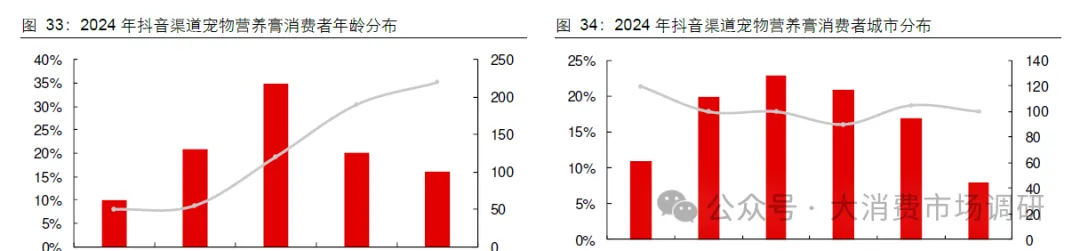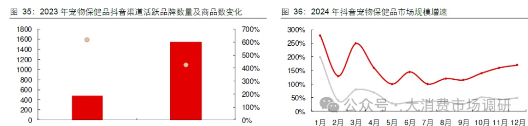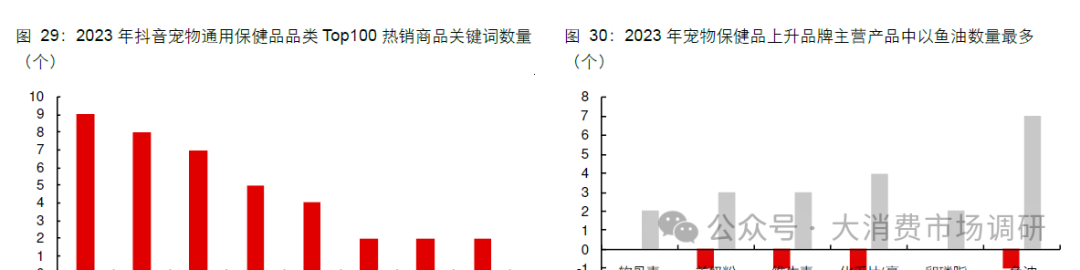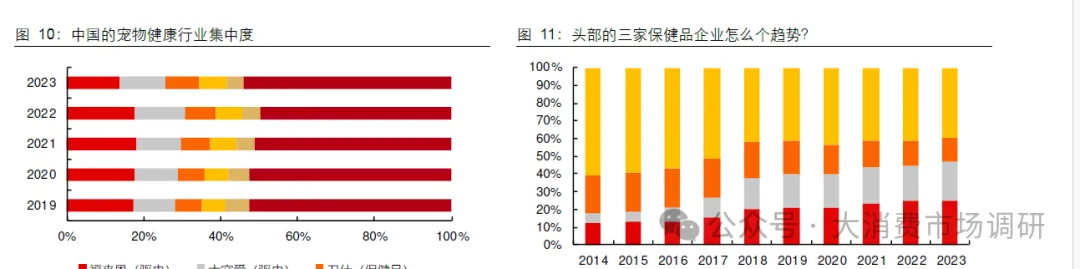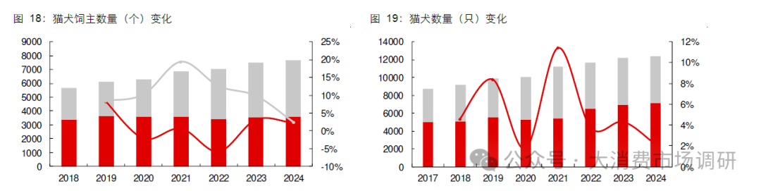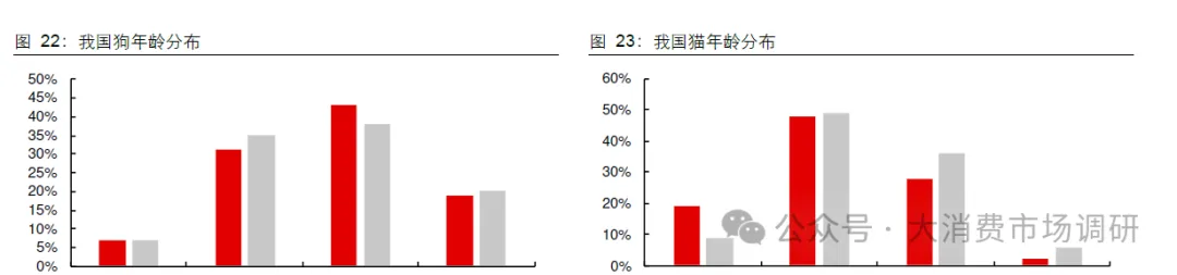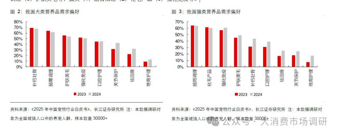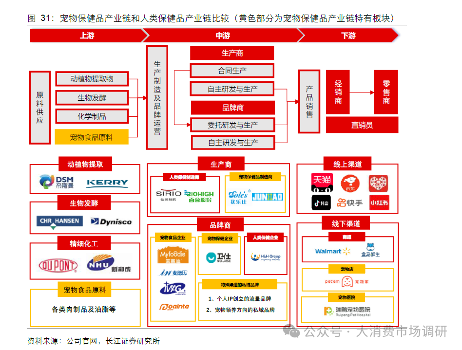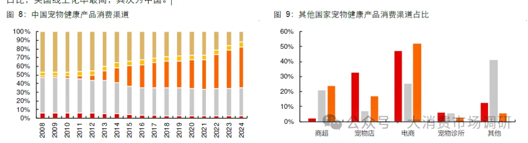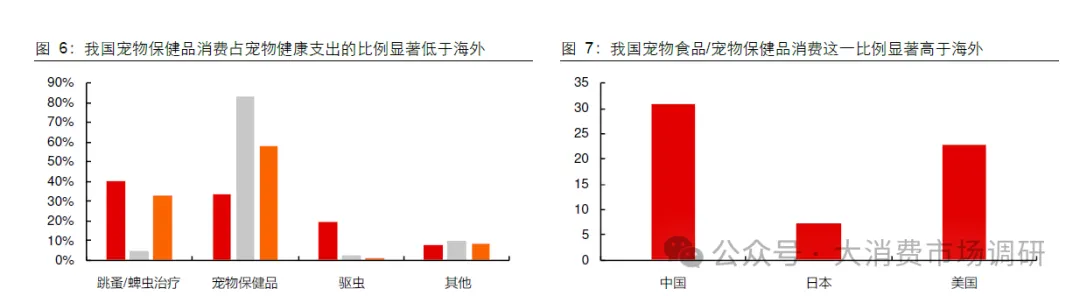 · 宠物保健品新蓝海,持续增长源于拟人化需求 宠物保健品市场,即给宠物服用的营养品相关产业,近年来呈现较强的增长势头。当前,各类企业加速涌入的趋势持续增强,市场或在中期及以上时间维度仍处于高度景气状态。 同时,我们认为这一行业的潜力仍处于挖掘初期,而得出这一判断的底层逻辑来自宠物养护的第一性原理,即拟人化。 拟人化是宠物保健品需求增长的第一性原理宠物保健品定义较为宽泛,本文的定义中不包括驱虫药和复配宠物粮,而主要针对特定的宠物膳食补充剂品类进行讨论。宠物保健品功能分化,但背后反映宠物主对经济效益、延缓衰老、形象美化的考量。从产品来看,当前市场主要流行三类产品:(1)奶粉(2)常用维生素(3)针对解决特定病症的比如化毛膏、祛泪痕膏、鱼油颗粒、辅酶Q10 颗粒等。 细分需求来看,当前的消费者购买主要集中于以下功能:犬类(1)补钙壮骨(2)肠胃调理(3)护肤美毛等;猫类(1)肠胃清理(2)化毛产品(3)强化免疫等。 从众多功能区分来看,各类产品解决的是宠物在不同年龄阶段的特定需求,其背后反映的是保健品解决的三种考量:经济效益、延缓衰老、形象美化。 类比人类营养需求,我们发现宠物及人类保健品需求同质化程度高,其背后反映的是宠物保健品需求的拟人化。人类的生命周期划也分为三个大的阶段,即幼年以身体生长发育、成年以营养补充和特定疾病缓解、老年以身体养护和老年病治疗为三大核心阶段。 宠物保健品市场发展的底层需求和人类保健品市场是极为类似的,而人类在养宠方面的物质和情感投入使得这一相似性在同类型市场中表现的更加具象。我们认为这是宠物保健品市场未来能有大空间的底层逻辑,即养宠拟人化。 市场情况:使用习惯仍处于培育期,电商占比正在提升17 亿元新蓝海市场,2013-2024 年CAGR 达约14%。从当前市场来看,以欧睿数据的口径,我国宠物市场2024 年总消费额接近1000 亿元人民币,其中宠物保健品2013 年为4.1 亿元,2024 年达到17.2 亿元,期间CAGR 达约14%,整体看处于初期景气成长阶段。 使用习惯仍处于培育期,看好相关需求快速提升。我国2024 年宠物保健品消费在宠物健康开支的占比约为34%,同期美国及日本该比例为58%及83%,从结构看我国宠物主在宠物健康方面的开支仍处于跳蚤/蜱虫治疗及驱虫相关的初级状态。另一方面,我国2024 年宠物消费粮健比(即宠物粮消费额/宠物保健品消费额)为31,美国及日本分别为23 及7,我国宠物主粮的开支比例显著高于日美,因此当前我国宠物保健品的使用习惯显著低于世界发达国家水平,存在较大上行空间。 渠道线上占比提升,宠物店及宠物医院构筑线下壁垒。从销售渠道来看,我国宠物健康行业(包括保健品、驱虫等)的消费渠道中电商占比最高且仍存在提升趋势,其次是宠物店。从海外来看美国电商比例高于中国,而日本的其他渠道(比如药妆店等)占比显著高于其他国家,这与当地的渠道销售限制有一定关系,如果整体看线上线下占比,美国线上化率最高,其次为中国。 品牌格局相对集中,卫仕及红狗成长趋势显著。从品牌格局来看,宠物健康用品中福来恩、大宠爱、卫仕占比最高,但是福来恩、大宠爱主要为蜱虫治疗和驱虫药品牌。如果仅看保健品赛道,我国市场中卫仕、红狗、麦德氏位于前三水平,且行业CR3 于近10 年趋于集中状态,这主要受益于卫仕及红狗两个品牌线上及线下的快速增长。 从以上基本情况中,我们可以看到我国的宠物保健品行业有几个典型的特点: 1、宠物保健品的使用习惯还在比较初级的阶段 2、渠道兼顾线下和线上,但是线上的增长趋势更强 3、在线上增速更快的背景下,行业CR3 并没有下行 综上,我们认为宠物保健品行业的发展底层逻辑来自养宠拟人化,相关需求与人类营养存在高度相似性,也因此我们判断行业会继续实现高速增长。同时相较于海外,我国的宠物饲养无论从宠物渗透率还是保健品使用习惯上都仍待挖掘,行业大盘空间和其中的产业链各环节或于中长期不断涌现新的投资机会。 市场规模长期看空间较大,中期宠物老龄化或带来需求脉冲 从宠物保健品市场的增长趋势来看,从拥宠数量、猫狗结构、消费习惯提升空间上都存在较大上行机会,行业远未达到需求天花板。同时,分析了我国宠物年龄结构及当前行业的渠道增长模式后我们发现市场在中期存在需求上行的脉冲式机遇。 长期空间来自消费趋势变化,行业或存在9 倍市场空间从成长逻辑来看,我国宠物保健品消费的增长动力来自:(1)拥宠数量(2)猫狗结构(3)消费习惯提升。 长期看好陪伴经济,我国拥宠数量有望进一步提升。随着经济的增长和年轻群体自我意识的不断增强,在城镇化的背景下,我国结婚登记人数处于较低位置。同时带来的社会现象是单身率的上行和出生率的走弱。宠物的强陪伴属性在这一时代背景下得以突出显现。 受文化因素及卫生事件影响,近年来宠物猫增长趋势显著强于宠物犬。从宠物饲养的趋势来看,近年来猫主的上行速度显著快于狗主。这与我国城镇化及小家庭模式相关度较强,尤其在卫生事件期间,因宠物狗需要户外活动等缘故,更适合室内陪伴的宠物猫的数量增长趋势显著强于宠物犬。 宠物粮及相关用品使用习惯显著低于发达国家,我国宠物保健品渗透率有望进一步提升。 除了宠物数量的显著提升以外,我国商品粮使用率