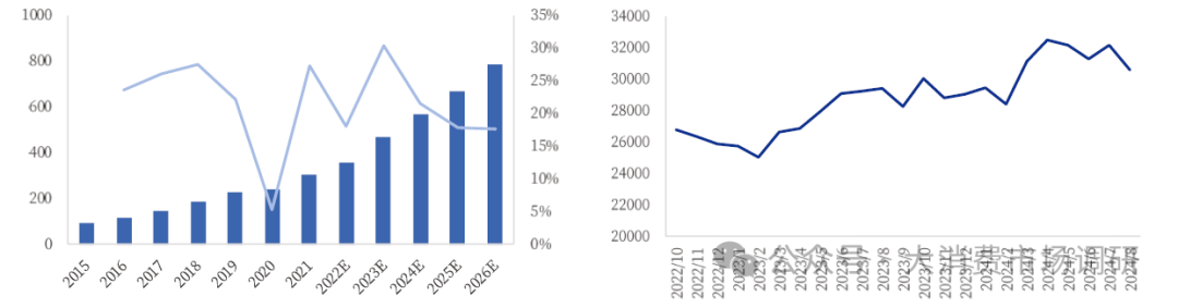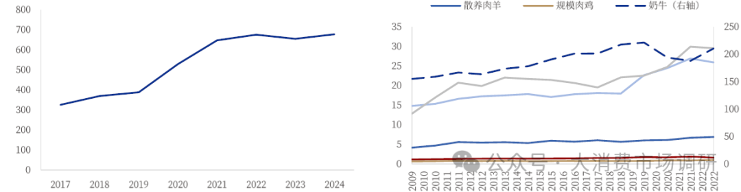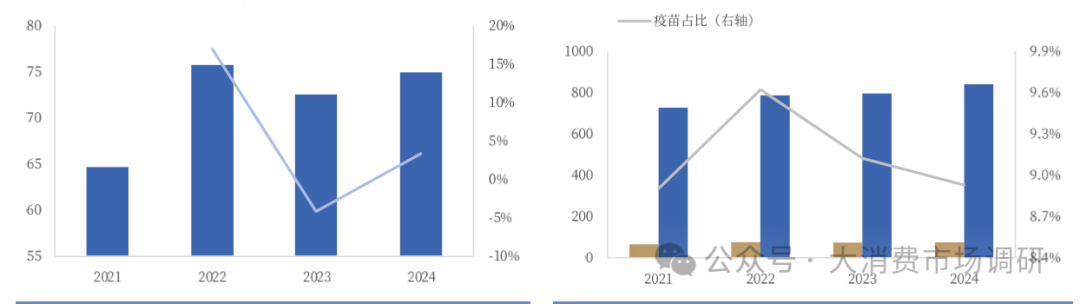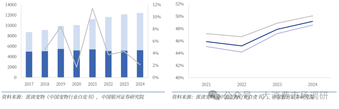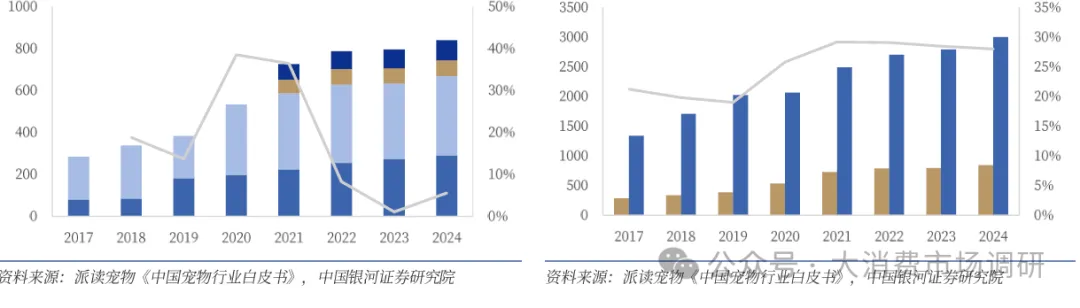 · (一)宠物医疗行业规模超800亿,未来增长空间广阔 我国宠物医疗市场快速扩容,24年规模超800亿元。根据派读宠物白皮书,宠物医疗为宠物行业第二大子行业,2024年市场规模为841亿元,同比+5.6%,2017-2024年CAGR 为+16.7%,占宠物行业总规模的比例自2017年的21.2%提升至2024年的28%。2020年以来,我国频繁出台宠物健康相关政策,一方面鼓励宠物疫苗及药品国产研发创新,另一方面规范兽医行业机构管理和人才建设。 后续看我国宠物医疗市场未来增长空间,可以从量、价两方面拆分来看。 一方面,来自于量的提升,包括宠物数量的增加、免疫率提升等。从宠物绝对数量的增长来看,犬猫为我国主要的宠物饲养品种,2024年我国宠物犬猫数量合计1.24亿只,同比+2.1%,2017-2024年CAGR 为+5.1%,呈稳定增长态势,其中宠物猫的增速高于宠物犬。但对标国外成熟市场,我国宠物渗透率仍有较大提升空间。根据尼尔森IQ,2022年我国宠物渗透率为22%,同期美国、澳大利亚、加拿大等成熟市场渗透率均超过50%,较日本28%的宠物渗透率亦尚存差距。 从免疫率提升的角度来看,近年我国宠物犬猫免疫率呈提升趋势,2024年宠物犬、猫免疫率分别达50.1%和48.6%。以狂犬疫苗为例,2024年我国宠物犬接种率达61.4%新高,自2019年起基本保持上行态势。根据WHO,一个地区的犬只狂犬病免疫率达到70%以上,就可以建立起有效的免疫屏障,切断狂犬病的传播。对比 2017年美国宠物狗的狂犬病免疫率就已超过90%,我国宠物免疫率仍与发达国家有较大差距。整体来看,我国养宠人士防疫意识有提升空间,意味着宠物免疫率有较大提升空间。 另一方面,来自于医疗消费价格较高及其带来的盈利优势。从纵向变化来看,根据派读宠物白皮书,2024年我国宠物(犬猫)只均医疗消费额约677元,同比+3.4%,2017-2024年 CAGR为+11%。随着宠物主对宠物健康重视度的日益提升,单只宠物医疗消费额呈现持续上行趋势,助力我国宠物医疗市场扩容。从横向对比来看,相比畜禽等经济动物,宠物诊疗费、疫苗及药品定价等均存在盈利优势。2022年我国主要经济动物中,只均医疗防疫费最高的奶牛为210元,其余畜禽只均医疗防疫费均在30元以下,而同期单只宠物年医疗消费676元,差距显著。宠物医疗消费的高定价带来毛利率优势,或将成为相关企业盈利增厚的新突破点。 (二)宠物医院快速多元发展中,行业盈利能力暂承压 作为宠物医疗的关键载体,我国宠物医院市场处于快速发展阶段。根据派读宠物白皮书,宠物诊疗(主要载体为宠物医院)是我国宠物医疗行业占比最高的子行业,2024年市场规模为378亿元,同比+5%,占比达45%。在宠物医疗行业产业链中,宠物医院处于核心枢纽位置,为宠物医疗服务发生的主要场所。相比美国等宠物医疗行业发展较为成熟的国家,我国宠物医疗行业起步较晚,在行业规模、渗透率、消费水平、规模化和专业程度等方面均存在较大差距,尚处于快速发展的阶段。 我国宠物医院数量持续增长中,截至2024年8月,宠物医院数量已达 30588家,较2022年10月增加14.2%。在医院数量增加的驱动下,我国宠物医院市场规模处于快速提升状态。根据Frost&Sullivan,2021年我国宠物医院市场规模达303亿元,同比+27.3%,2015-2021年CAGR 为+21.8%,占宠物护理市场规模的比例自2015年的46.5%提升至2021年的55.6%,预计至2026年,我国宠物医院市场规模有望达789亿元。 我国宠物医院市场格局较为分散,龙头渠道优势显著。由于我国新开宠物医院的准入门槛相对较低,单体医院仍为主要形态。根据爱宠白皮书,2024年我国单体医院占比为78.9%;连锁化为我国宠物医院未来发展趋势,连锁医院占比自2021年的20.1%提升至2024年的21.1%。 从收入角度看,2022年我国宠物医院市场CR10为15.4%,CR2为 11.8%(22年新瑞鹏、瑞派的宠物护理业务营收分别为29.6亿元和12.6亿元,市占率分别为8.3%和 3.5%),集中度较低,市场格局较分散。其中新瑞鹏作为行业龙头,产业链覆盖最为完善,具有显著的渠道优势。在2024年我国宠物医院使用率Top10中,多数为新瑞鹏旗下宠物医院品牌。 23年以来宠物医院行业盈利承压,主要源自消费降级及成本端压力加剧。根据爱宠白皮书,23-24年宠物医院的量价两端均呈现下行趋势。一方面,23年以来日均客户数在10个以下的宠物诊疗机构占比明显增加,24年约八成以上的宠物诊疗机构日均客户数在20个以内;另一方面,平均客单价也有明显下降, 24年绝大多数宠物诊疗机构的平均客单价在500元以下(占比约95.8%),而22年时平均客单价在500元以下的占比仅58%。 在量价双降的影响下,月营业额在20万元以下的宠物诊疗机构占比自22年的78.7%上升至24年的80.3%;利润率在10%以下的宠物诊疗机构占比自22年的55.6%上升至24年的70.4%,其中亏损的机构占比自22年的19.5%上升至24年的26.5%。24年我国宠物诊疗机构总体利润率水平约为-26.5%(同比-1pct)。行业正处于新一轮的洗牌调整中。 我们认为导致行业盈利下行的主要原因是消费降级及成本端压力加剧等。在宏观经济环境下的消费降级趋势影响下,宠物医疗消费的主力军中产阶级和GenZ年轻人收入受影响;同时由于宠物医疗多为自费项目,消费者与宠物医院之间关于定价的矛盾被放大。此外,宠物医院的各项成本呈增加趋势,压缩了企业利润空间。例如行业人才稀缺下的人力成本提高、政府监管趋严下的运营成本上升、高进口依赖度下的设备和药物成本上升,以及宠物医院数量增长下