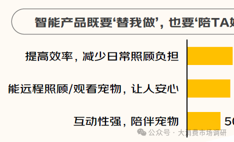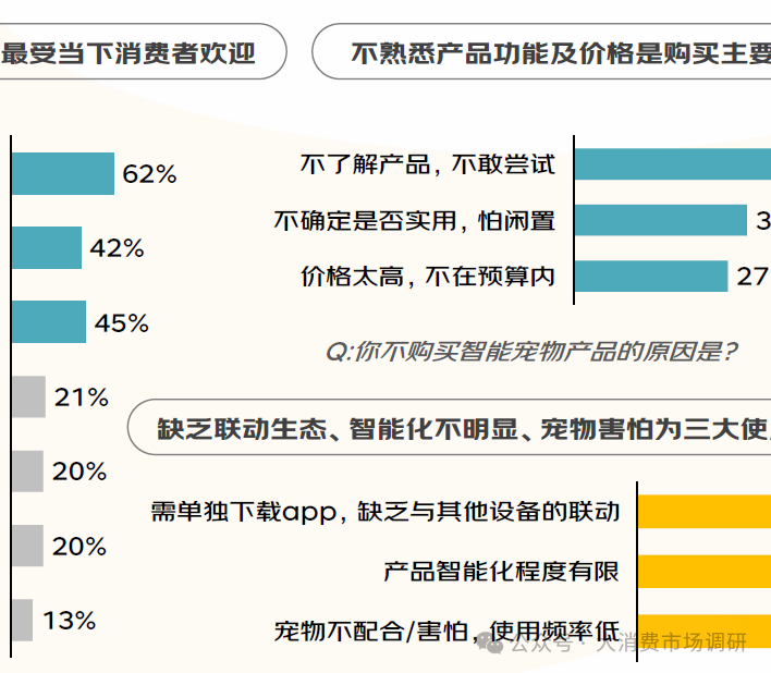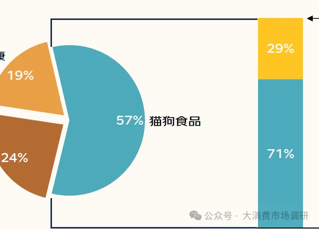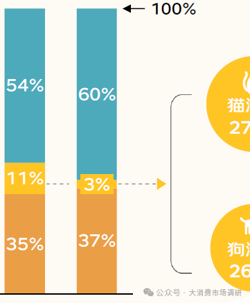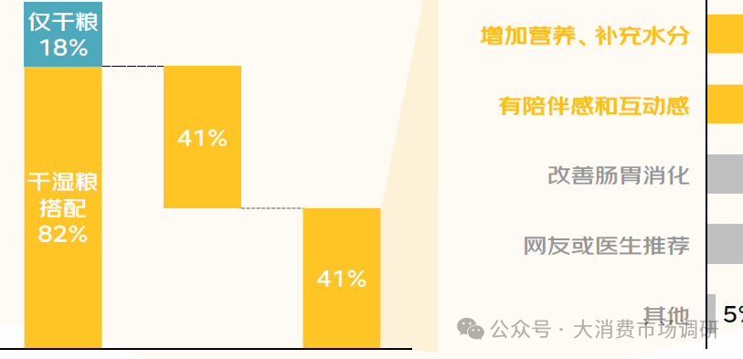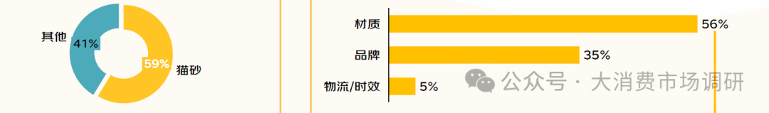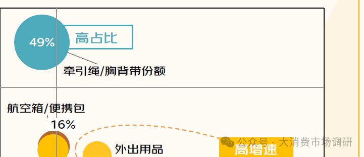 · “宠以食为天”,近一年京东猫狗食品以近六成销售额占比支撑整体市场,其中猫食品以71%的销售额占比主导食品消费。 宠物食品板块迎来用户加速增长,其中猫食品买家数同比增速超狗食品,高达48%,而狗食品客单价高于猫食品(~1.3倍),且用户增速稳健(+39%),凸显其高价值人群的消费潜力。 猫狗湿粮同比成交量增速均超260%,相比狗宠主,猫宠主主更偏爱湿粮(占食品成交量11%),因养猫人的陪伴互动和猫咪补水需求。调研显示,八成以上的养宠人有搭配湿粮喂养宠物的习惯,超四成经常搭配湿粮;购买湿粮的主要动因是提升宠物饮食愉悦感、增强营养与补水以及使用罐头和宠物互动。 养宠人消费决策从品牌延伸至适龄、适种、适体型,专宠专用趋势明显,以犬干粮为例,适用阶段、品种、体型进入TOP5关键决策因素。2024年老年犬粮销售额同比增长67%,成交量同比增长87%,搜索增长62%,除基础功效外,添加特定成分调理肠胃、腔、改善认知障碍”的老年犬粮处上升趋势。 猫砂在清洁类用品中销售额占比近六成,且增速可观,达44%。 材质、品牌、物流时效是购买猫砂的TOP3决策关键因素,植物猫砂因环保、健康、吸水结团和不粘底等功效特点,销售额增速高达307%,木薯猫砂搜索量同比超10倍。 近一年,猫狗出行用品中,胸背带/牵引绳贡献近5成成交量;外出用品类、配饰类、训练器/止吠器增速表现出众。宠物出行用品中,拟人化用品增速亮眼,宠物外出婴儿车成交量同比增速超10倍、宠物配饰成交量同比增速58%。 近一年宠物用品中,生活改善类(空气净化器、烘干机)、远程看护类(摄像头、项圈 智能宠物用品搜索量增速明显,用户购入智能产品 的主因是“便捷养宠"、“远程看护”和"陪伴宠物";调研结果显示,生存需求类产品(喂食、猫砂盆〉和互动类产品(智能玩具)最受欢迎。智能化产品既要“卷功能"也得“卷生态”。调研表示,系统生态不适配、智能程度有限成关键使用痛点。