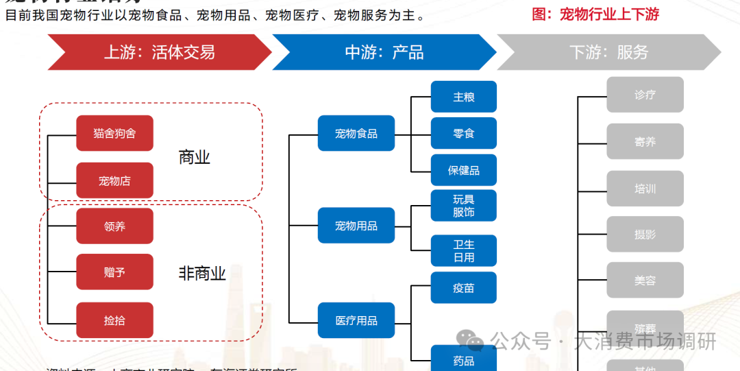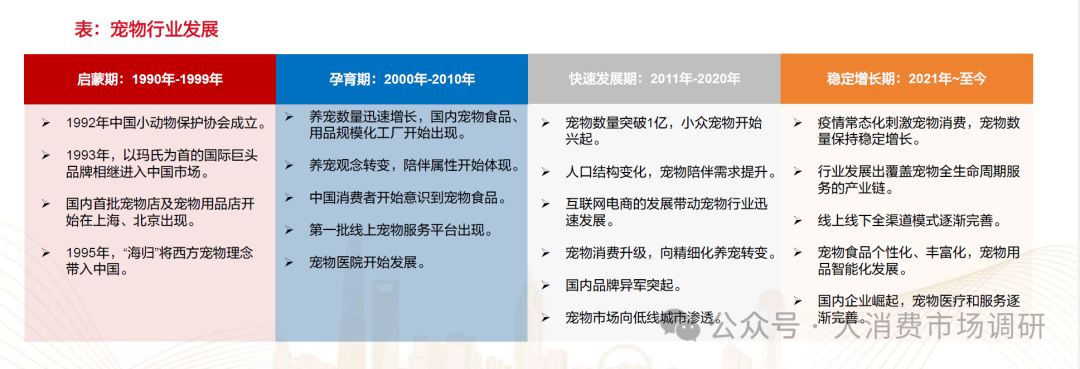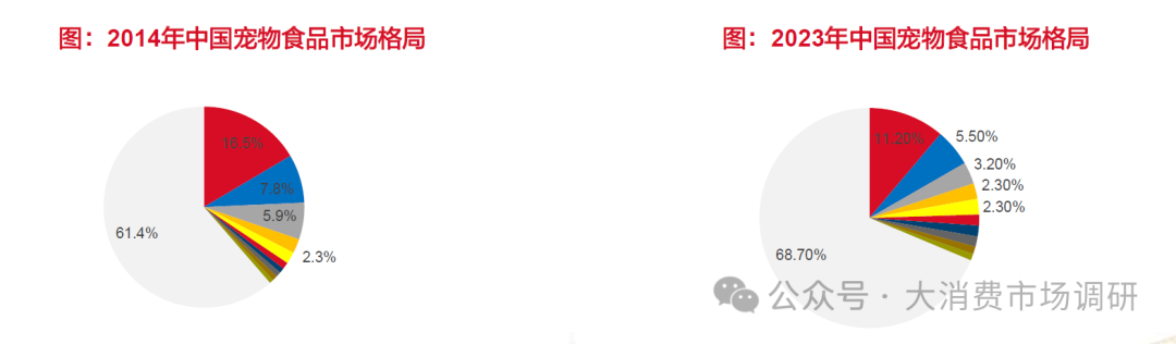 · 我国宠物市场起步较晚,但是市场发展速度快、规模大。20世纪初美国高度发达的工业水平推动了宠物行业萌芽的产生,商业化宠物食品逐渐代替了以人类食物残羹为主的宠物粮食。自此,世界各国宠物市场开始迅速发展。 宠物食品占宠物行业消费52.30%,其中主粮为主要产品。主粮为宠物日常能量摄入来源,营养均衡可以长期喂养。零食一般含肉量高、适口性好,但营养来源较为单一,不适合长期喂养。保健品具有较强针对性,市场规模较小。我国下游消费市场渠道丰富,线上、线下全渠道发展。目前,国产品牌大多持续布局线上销售渠道,线上渠道为我国宠物食品市场最主要的销售渠道。主粮日常消耗量大,为宠物食品行业主要的消费产品,2023年主粮消费占宠物食品消费约67.50%。 宠物市场规模持续扩大,保持较强韧性。2020年城镇宠物(犬猫)市场规模为2065亿元,2023年达2793亿元,2023年同比增长3.22%。其中,宠物食品市场规模2022年为1372亿元,同比增长7.02%。2016年-2022年CAGR达20.11%,近年来宠物食品市场规模增速高于行业规模增速。宠物陪伴需求日益增加,我们预计未来我国宠物市场仍将保持稳定增长。 我国宠物食品行业竞争格局较为分散。2023年美国宠物食品行业公司CR10为76.10%,日本为85.30%,我国仅为31.30%。2023年美国宠物食品行业品牌CR10为42.00%,日本为49.90%,我国为24.20%。随着宠物食品行业市场不断成熟,市场呈现集中度变高趋势,在较为成熟的日本、美国市场,市场集中度仍然缓慢提升。未来中国宠物食品行业集中度有望持续提升,占据规模效应和先发优势的公司有望受益。 我国宠物食品行业国产替代趋势进行中。2014年中国宠物食品公司前5中,国外公司玛氏和雀巢分别占据16.5%和5.9%的市场份额,而到了2023年宠物食品公司前5中,玛氏和雀巢分别占据11.2%和3.2%的市场份额。国内公司在中国宠物食品市场中占比持续提升,乖宝宠物以及中宠股份提升幅度较大,目前分别位列第二和第四。 宠物食品市场品牌竞争激烈。目前高端国产宠物食品品牌存在缺口,仍被部分国外宠物食品品牌占据,例如爱肯拿、渴望以及生鲜本能。玛氏与雀巢进入中国宠物食品市场时间较早,由于当时市场成熟度较低,其皇家和冠能品牌受市场追捧。目前国内宠物食品公司布局高端粮系列,例如佩蒂股份的爵宴以及乖宝宠物的弗列加特和汪臻醇系列等。未来,无论是在大众品牌、中高端还是高端品牌国内宠物食品市场的品牌竞争仍会加剧。
