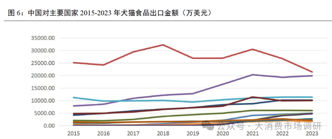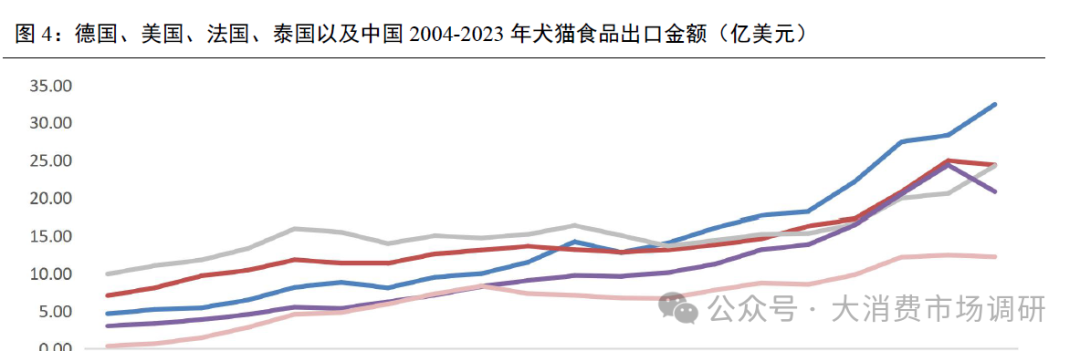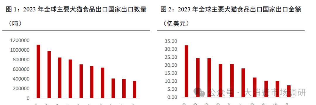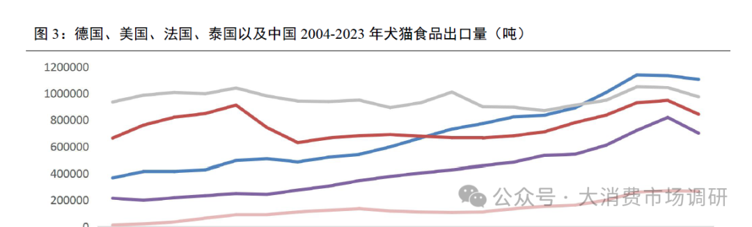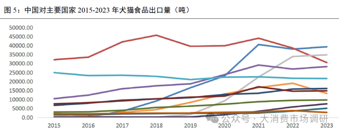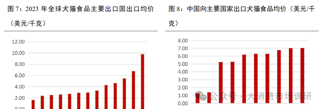 · 1.对标欧美成熟市场,我国宠物食品产业出海还有多大差距? 我们深入拆解并横向比对了各国家海关披露的犬猫食品类目(HS Code:230910)数据,L年·从出口数量、出口金额、出口目的地、出口均价等维度和欧美等宠物产业发达国家进行我们认为,当前我国宠物食品产业出口规模和产品结构等多个维度上相较领先国家均有数年的差距。 1.1出口规模:位列全球第7,欧洲及美国出口领先 根据Trade Map及各国家海关统计数据,2023年我国宠物食品中犬猫食品出口量为26.60万吨,同比减少1.15%;出口金额为12.26亿美元,同比减少1.48%,占全球犬猫食品出口总金额的4.94%,位列全球第7,前6名分别为德国(32.43亿美元)、美国(24.34亿美元)、法国(24.25亿美元)、泰国(20.81亿美元)、波兰(20.66亿美元)、荷兰(17.97亿美元),其中德国、法国等欧洲国家主要是向欧洲内部其他国家出口。考虑到关税壁垒在一定程度上影响我国加工饲料及加工食品出口规模,我们认为从出口规模来看,当前我国宠物食品行业出海水平距离德美法等领先国家或仍有超过十年的差距。 1.2 出口目的地:欧美日市场依然重要,东南亚增速迅猛 根据海关总署数据,2020年之前,我国犬猫食品出口量前三大国家为美国、日本及德国,且英国、韩国及荷兰等国家排名靠前。截至2023年,美德日依然是国内宠物食品出口量前五国家,但是2015-2023年间,向欧美日绝大部分国家出口数量增长较缓,其中向美国出口连续2年下滑。出口金额方面,欧美日发达地区出口金额仍然保持较高水平。东南亚市场2017年左右开始迅速增长,向印尼出口量从2016年至2021年开始快速提升,CAGR为 141.95%,2021年位居第2,2023年升至第1,实现3.93万吨出口量;向菲律宾出口则是从2019年开始迅速增长,2023年出口3.48万吨,排名升至第2。近年来由于出口数量提升,向东南亚国家出口总金额持续增长,但相对欧美日等国仍处于较低水平。 1.3出口均价:德美等国出口均价低,对应产品结构以主粮为主 通过深入拆分并横向对比各国家海关总署披露的犬猫食品(HS Code: 230910)出口数据,我们发掘到宠物食品出口中一个反直觉的关键逻辑:出口产品的绝对高单价主要反映出口产品结构,而并不能代表强品牌效应所带来的丰厚溢价。除新西兰外,美国、加拿大等成熟宠物市场的出口均价在2-3美元/千克左右区间,而中国、越南以及柬埔寨等代工产品为主的出口均价一般高于4美元/千克,我们认为主要是由于出口产品结构导致。受原材料添加结构差异影响,零食产品每公斤均价远高于主粮产品,中国、泰国等亚洲国家主要以宠物零食代工为主,而德国、美国出口产品则以宠物主粮为主。以德国为例,其犬猫食品出口子类目中,依据淀粉以及乳制品含量进行了进一步详细划分,淀粉含量>10%的犬猫食品占主;根据宠物食品产品原料构成来看,淀粉含量>10%的犬猫粮产品一般是以犬猫主粮为主,进一步说明了德国犬猫食品出口均价不足3美元/千克是由于以宠物主粮占主的产品结构导致的,美国出口情况亦是如此。 1.4出口结构:我国宠物食品出口不同目的地均价差异大,对欧美市场出口依然以宠物零食为主 根据海关总署数据,2023年我国犬猫食品向主要出口国出口金额分别为:印尼(0.50亿美元)、美国(2.14亿美元)、菲律宾(0.49亿美元)、德国(1.99亿美元),对应出口均价分别为印尼(1.27美元/千克)、美国(7.01美元/千克)、菲律宾(1.40美元/千克)、德国(7.04美元/千克),出口东南亚国家和出口美国德国等均价差距非常大。按照上文的逻辑,我国出口至东南亚国家以低端犬猫粮为主,而出口欧美市场的产品则仍以代工的宠物零食为主,均难以形成品牌效应。此外,根据海关总署公布的出口类目分类,我国犬猫食品(HS code: 230910)类目下有两个子类目,对应的是罐头包装犬猫食品(HS code:23091010)及非罐头包装犬猫食品 (HS code:23091090),2023年这两类出口金额分别为0.59亿美元/11.67亿美元,出口均价分别为1.89美元/千克以及4.97美元/千克,非罐头包装犬猫食品(HS code: 23091090>出口单价与我国向欧美等发达国家出口的单价水平接近,进一步说明了我国宠物食品主要出口类目非罐头包装犬猫食品(HS code: 23091090)仍是以较高单价的宠物零食为主,宠物主粮占比较低。我们认为从均价对应的产品出口结构维度来看,我国宠物食品出口与欧美存在的差距或许比上文提到的出口规模维度更加巨大。