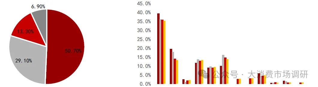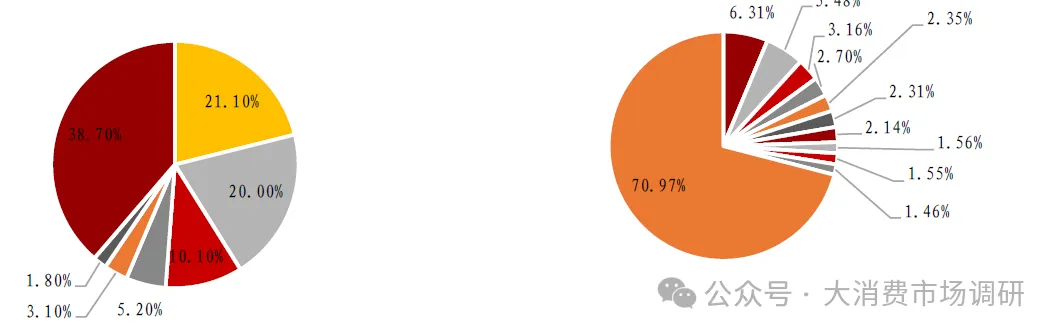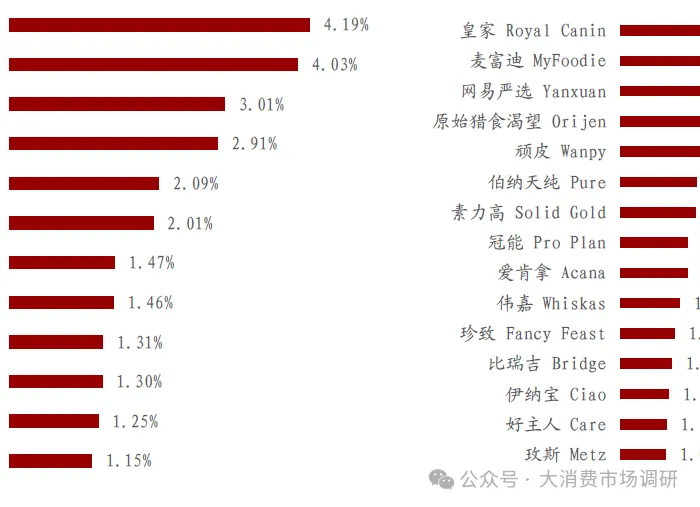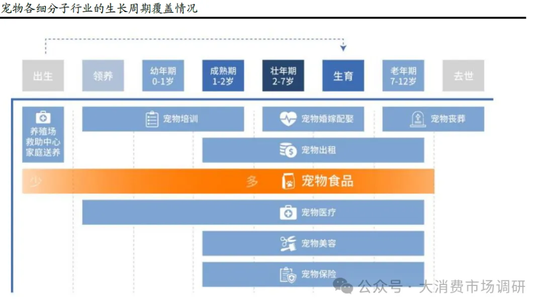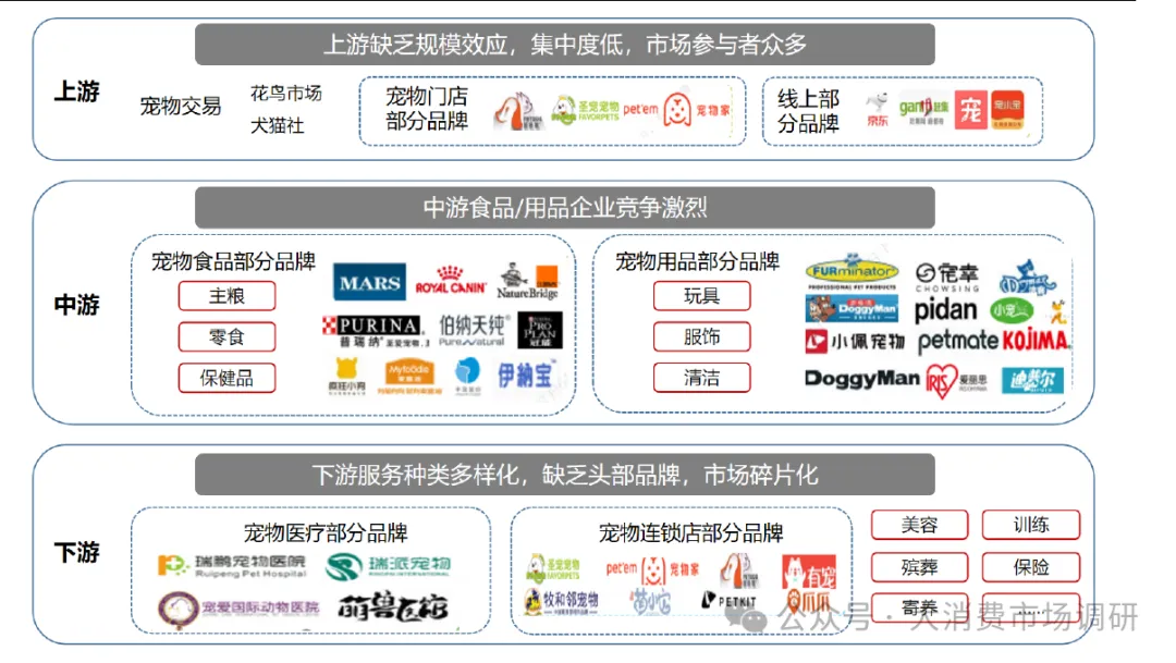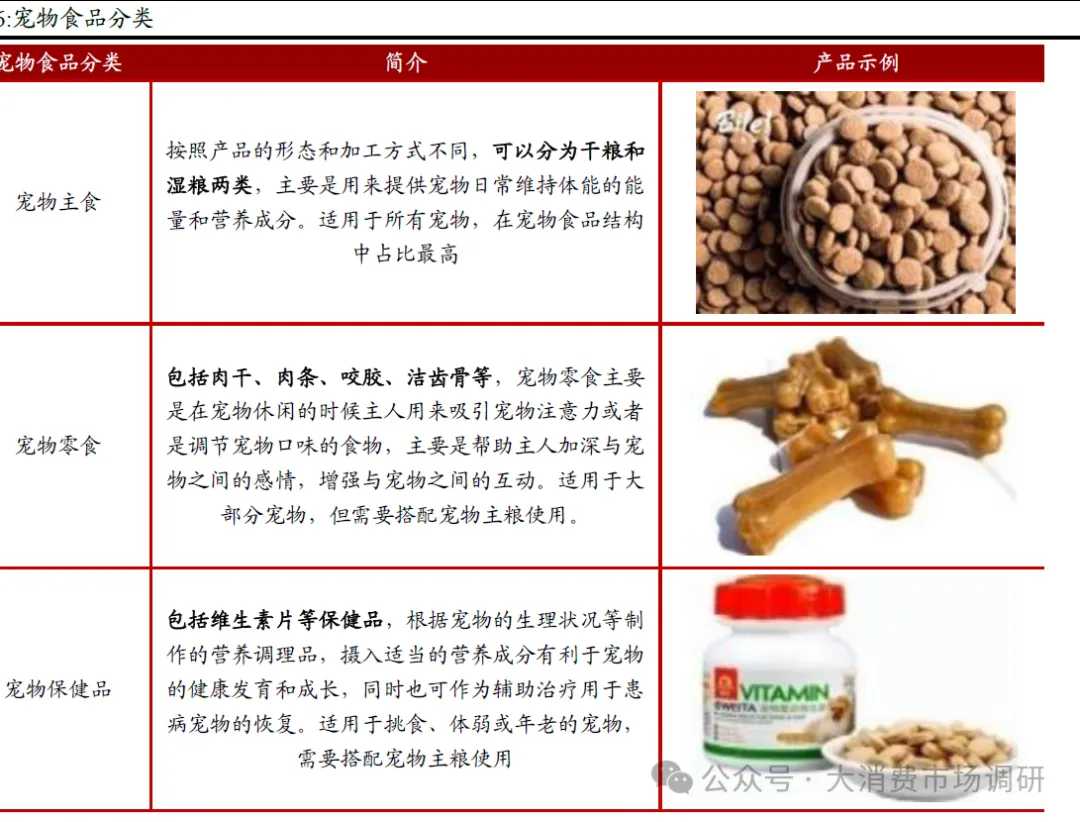· 1 宠物行业产业链:食品和医疗消费占比最大,医疗占比持续提升 近年来,宠物行业产业链逐渐清晰、完善,子行业种类日益丰富。宠物行业主要包括宠物饲养、宠物交易、宠物食品、宠物用品、宠物医疗、宠物美容、宠物训练、宠物保险以及宠物殡葬等一系列商品和服务链条,各部分具有各自独特的行业特点,已分别发展成独立的子行业。随着宠物行业需求的不断延伸及开拓,宠物商品及服务的种类日益丰富,已发展成覆盖宠物生老病死、衣食住行的完整产业链。1)上游:宠物饲养交易为主,多为个人经营,缺少规模化企业;2)中游:包括宠物刚需的食品及用品,赛道内企业规模化程度高且竞争激烈,宠物食品在宠物行业内占主导地位,是行业爆发受益最大的子行业;3)下游:包括宠物医疗、洗美、培训等服务类企业,随消费需求升级细分赛道逐渐增多,个人店铺为主,连锁化品牌仍在发展中。 从贯穿宠物一生的消费角度来看宠物行业,宠物行业中各个子行业在覆盖宠物的生长周期、宠物使用频率等方面均有所不同。 ➢ 宠物食品在宠物的一生中使用频次最高且持续、稳定,涵盖宠物出生到死亡的全过程,属于饲养宠物的刚性需求,是目前宠物行业占比最高的子行业。 ➢ 宠物饲养交易仅发生在宠物出生到领养时期,时间跨度相对 较短。 ➢ 宠物医疗、培训、美容等个性化服务,根据宠物个体差异及宠物主的消费偏好不同而存在差异,发生频次相对较低且个体消费相对参差不齐。 宠物食品及医疗覆盖宠物生命周期长,合计占比宠物消费市场约80%。宠物食品及医疗涵盖宠物从出生至老年期的全需求,根据《2022年中国宠物行业白皮书》和《2021年中国宠物行业白皮书》数据显示,2019-2022年宠物食品在产业链中的占比分别为61.4%/54.7%/51.5%/50.7%,宠物医疗占比分别为19.0%/25.8%/29.2%/29.1%,整体均远高于其他细分行业。其中,宠物医疗占比在近年来提升明显,推测主要是由于宠物主人健康意识的提升、科学养宠和宠物大健康理念兴起,促使宠物医疗需求快速提升。 主粮消费占比最大,内外资企业竞争激烈 宠物食品是介于人类食品与传统畜禽饲料之间的高档动物食品,指按照专业宠物的生理周期和种类及个体的营养要求,专门研制的全营养食品。宠物食品能够提供宠物生长所需要的营养物质,具有营养全面、消化吸收率高、配方科学、饲喂方便以及可预防某些疾病等优点。宠物食品是饲养宠物的刚性需求,贯穿宠物整个生命周期,具有复购性高、价格敏感性低、黏性强的特点。 专业宠物食品与剩饭剩菜相比,具有营养全面、消化吸收率高、配方科学、质量标准、饲喂使用方便、可预防某些疾病和延长寿命等不可替代的优点。宠物与人类的生理特征有所差异,长期喂养剩饭剩菜会对宠物的肾脏、肝脏造成较大负担。而宠物食品是专门针对宠物的生理特征设计,更有利于宠物的健康。此外,宠物食品尤其是宠物干粮,大多便于储存且开袋即食,具有便捷、环保等优点。伴随着养宠人群消费理念的升级,专业宠物食品的渗透率将持续提升。 宠物食品可分为宠物主粮、宠物零食和宠物保健品。宠物主粮是指为满足宠物不同生命阶段或者特定生理、病理状态下的营养需要,将多种饲料原料和饲料添加剂按照一定比例配制的宠物饲料,单独使用即可满足宠物全面营养需要,宠物主粮中宠物干粮占比最高。宠物零食通常是指能够补充单一或部分营养素但不追求全面平衡营养,人们为吸引宠物注意力、调节宠物口味、加深人宠之间感情、增强人宠互动、协助宠物训练所需要的产品。如冻干零食、烘干零食、风干零食、零食湿粮、咬胶、洁齿骨等。宠物保健品为满足宠物各生命阶段及其生理需要而制作的营养补充剂,补充和强化单一或多种营养素,以利于宠物的健康发育和成长。 我国宠物食品行业起步较晚,市场规模年复合增长率显著高于全球。2012年至2023年,全球宠物食品市场规模的CAGR为5.23%。2012至2023年我国宠物食品市场规模呈现逐年增长的趋势,截至2023年我国宠物食品市场规模达到509.8亿元,2012年至2023年CAGR达22.39%,显著高于全球宠物食品市场规模增速。相比其他宠物产业链环节,宠物食品产业贯穿宠物抚养的整个生命周期,消费频次较高。高消费频次伴随着消费升级的整个过程,带来了宠物食品人均消费量及消费金额的不断提升;此外,随着我国宠物数量的不断增长、宠物饲养渗透率的日渐提升,我国宠物食品市场有望随之继续保持增长。 全球宠物食品市场较为集中,玛氏、雀巢等龙头企业占据半壁江山。几家龙头品牌凭借丰富的市场开拓经验、雄厚的资金实力、突出的研发能力以及较高的产品知名度在国际市场上占据主要份额。2023年玛氏和雀巢在全球宠物食品行业中的市占率排名前两位,分别为21.10%、20.00%,占据了整个全球宠物食品行业将近一半的市场规模。相较于国际市场,国内的宠物食品市场集中度较低。 目前国内宠物食品行业集中度较低,国内外品牌竞争激烈。根据萝卜投资数据,2023年我国宠物食品市场CR5和CR10仅为20.00%和29.03%,排名第一的为外资企业皇家,市场份额为6.31%。由于欧美国家厂商起步较早,具备规模化成本优势和多年积累的良好的品牌形象,在国内宠物食品市场份额竞争中仍有一定优势。另一方面,随着国内宠物食品厂商的持续发展,部分具备先发优势的企业后来