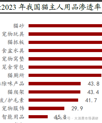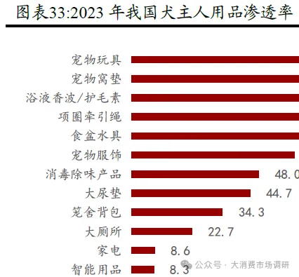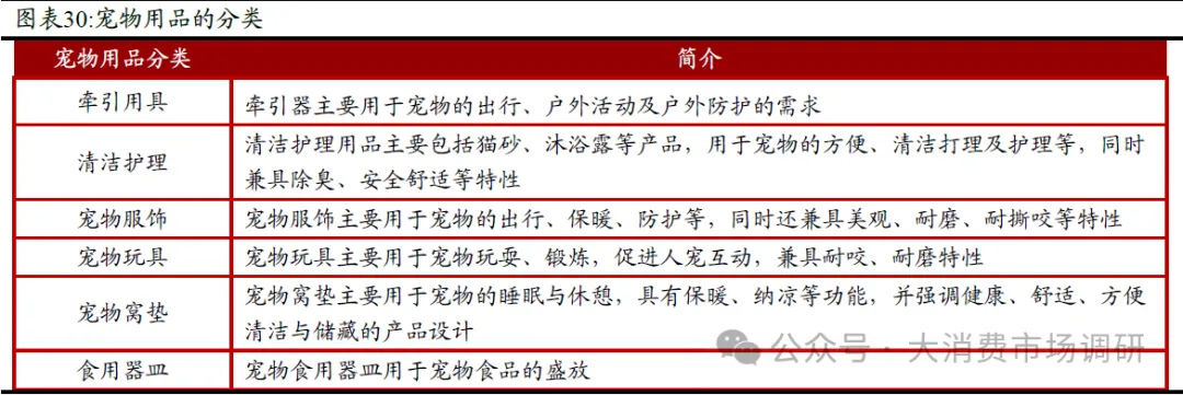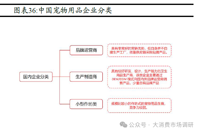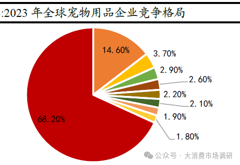 · 宠物用品特指专门针对宠物群体所研发、生产和使用的用品,主要包括牵引器、清洁护理、宠物窝垫、食用器皿、宠物服饰、宠物玩具等,细分品类较多。宠物用品作为饲养宠物的刚需产品,未来需求量也将不断增大。并且,随着宠物主年轻化以及养宠拟人化的趋势,越来越多的宠物饲养者已经将宠物视作家庭成员,并通过给宠物购买胸背带、衣物、圣诞礼物等方式加强自身与宠物间的联系,因此,宠物用品行业未来仍有较大增长空间。 我国宠物用品市场规模已达400亿元,过去5年年复合增速达13.6%,增速远高于全球市场。宠物用品行业是宠物行业的重要组成部分,随着全球宠物产业的发展,宠物用品市场也迎来稳定增长。全球宠物用品市场规模从2010年267.57亿美元增长至2023年的524.05亿美元,CAGR为5.31%。近年来,我国宠物用品行业市场规模呈现逐年上升的趋势。我国宠物用品行业市场规模从2018年的214.9亿元增长至2023年的407.0亿元,2018-2023年的CAGR达13.6%。 宠物玩具、清洁护理用品、窝垫、食盆水具渗透率超6成,宠物智能用品、家电渗透率还比较低,未来智能化升级将成为大的发展趋势。根据《2023-2024年中国宠物行业白皮书》数据显示,2023年我国犬类用品渗透率前三的品类为宠物玩具76.8%、宠物窝垫76.7%、浴液香波/护毛素69.4%,猫类用品渗透率前三的品类为猫砂91.6%、宠物玩具85.4%、猫抓板75.1%;宠物家电和智能用品的犬猫用品渗透率均低于20%。智能用品主要包括智能饮水机、智能摄像头、智能喂食器、自动铲屎机等产品,随着年轻宠主生活节奏加快,以及越来越多的科技与家电领域头部公司如小米、美的等跨界入局宠物用品行业,我们判断中国宠物用品行业的智能化升级将成为大的发展趋势。 由于宠物用品覆盖面广、细分品类多,全球宠物用品市场的竞争格局较为分散,宠物用品的领先企业仍以国际品牌为主。其中,雀巢公司占据3.70%的市场份额,礼来动保、中央花园和宠物公司凭借高质量的宠物用品同样跻身前列,分别占据2.90%、2.60%的市场份额。 中国宠物用品行主要由三类市场参与者:1)宠物品牌运营商,这类企业具有非常好的营销优势,但自身并不自建生产工厂,依靠供应链采购贴牌产品。2)具有较好研发、设计、生产能力的卫生用品生产商,该类企业主要通过OEM/ODM模式向国内外品牌运营商销售产品,少量自有品牌产品,目前规模较大的包括:依依股份、芜湖悠派、江苏中恒宠物等。3)规模比较小的作坊式的宠物用品生商,竞争力较弱。宠物用品行业产品高度同化,品牌溢价较小,有成百上千个独立品牌和制造商,头部企业只占不到1%的市场份额。 国内的宠物用品厂商较多,市场集中度较低。宠物用品领域的产品有多样化的特点,细分品类较多,以宠物用品领域主要产品宠物牵引用具为例,其产品在规格、款式、用料等方面均有较大差异,产品较难形成标准化、规模化生产,因此行业内存在较多中小型的宠物产品生产企业。目前,随着国内宠物饲养观念的逐步发展,越来越多的家庭开始饲养宠物,预计未来宠物用品市场规模会继续扩张,对宠物牵引用具等宠物用品的需求也持续增加,越来越多的厂商开始进入宠物用品市场。因此,目前国内存在较多宠物用品制造商,相对的宠物用品的市场集中度较低。 宠物用品行业产业链完善,上游分散,宠物用品制造企业具有一定议价能力。宠物用品制造商处于行业中游,行业上游主要是纺织品、板材、塑胶、橡胶和金属等原材料的供应厂商。上游原材料供应商众多,行业内竞争激烈,整体来看宠物用品制造企业在原材料采购方面有一定的议价能力;行业下游是各种销售渠道,包括电商平台、综合超市和宠物门店等。