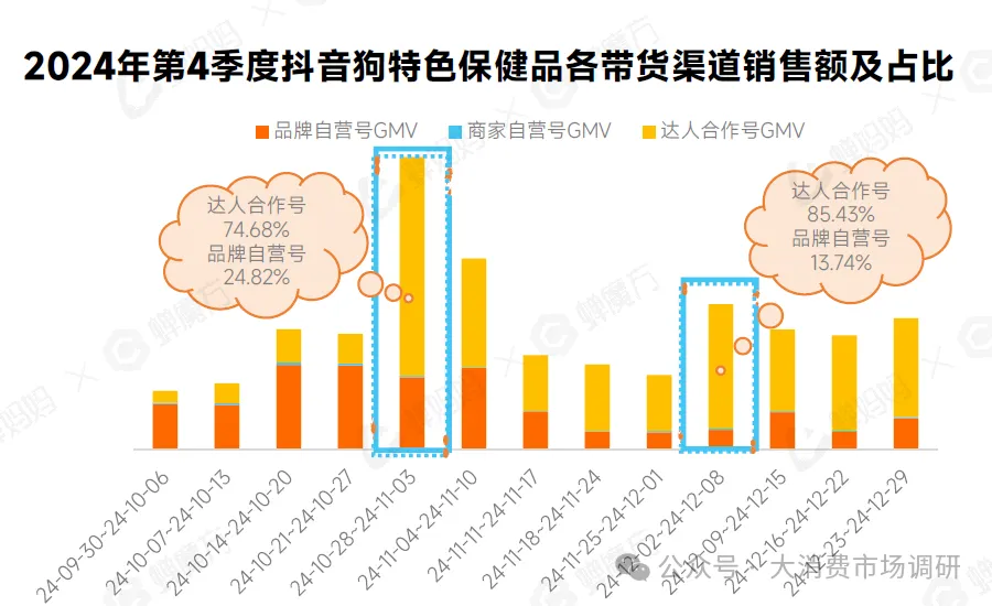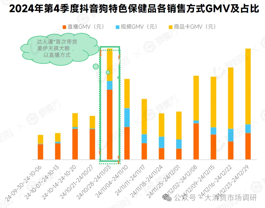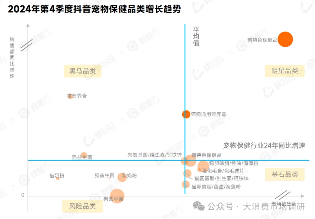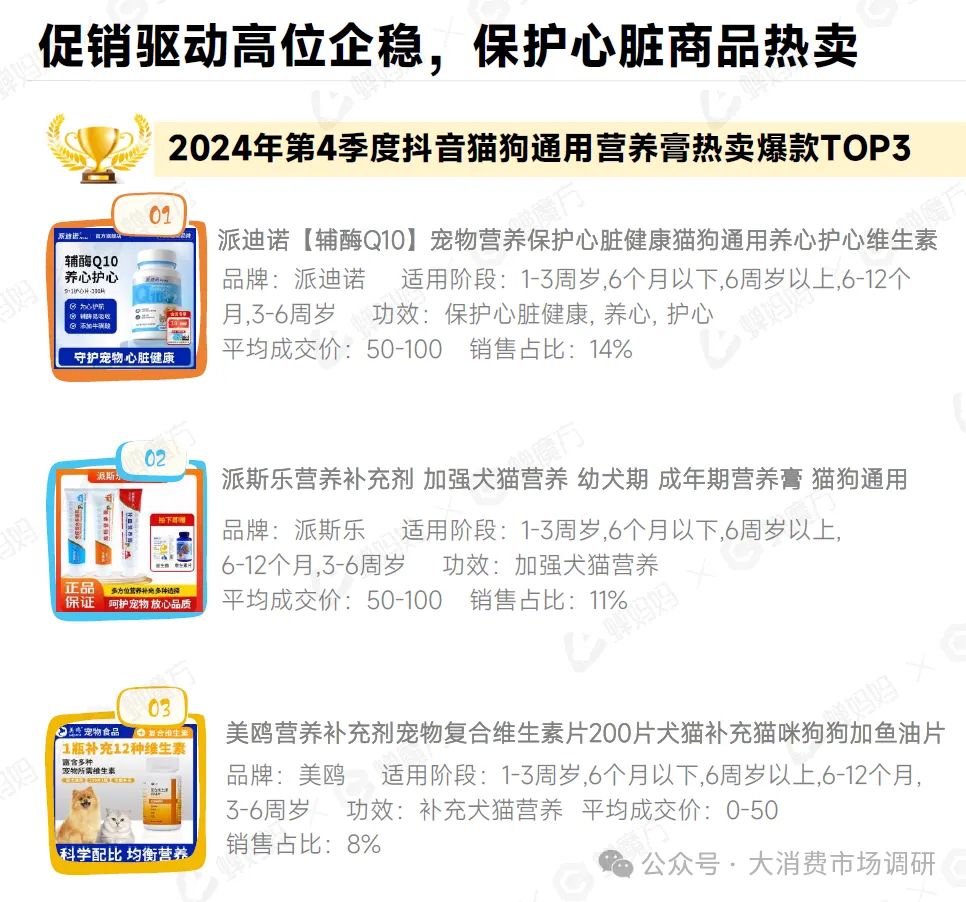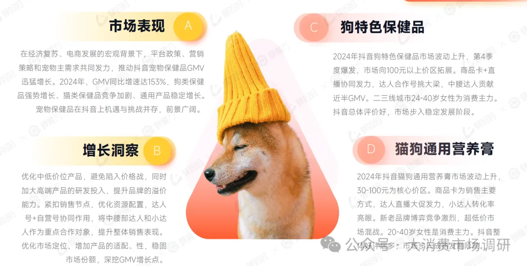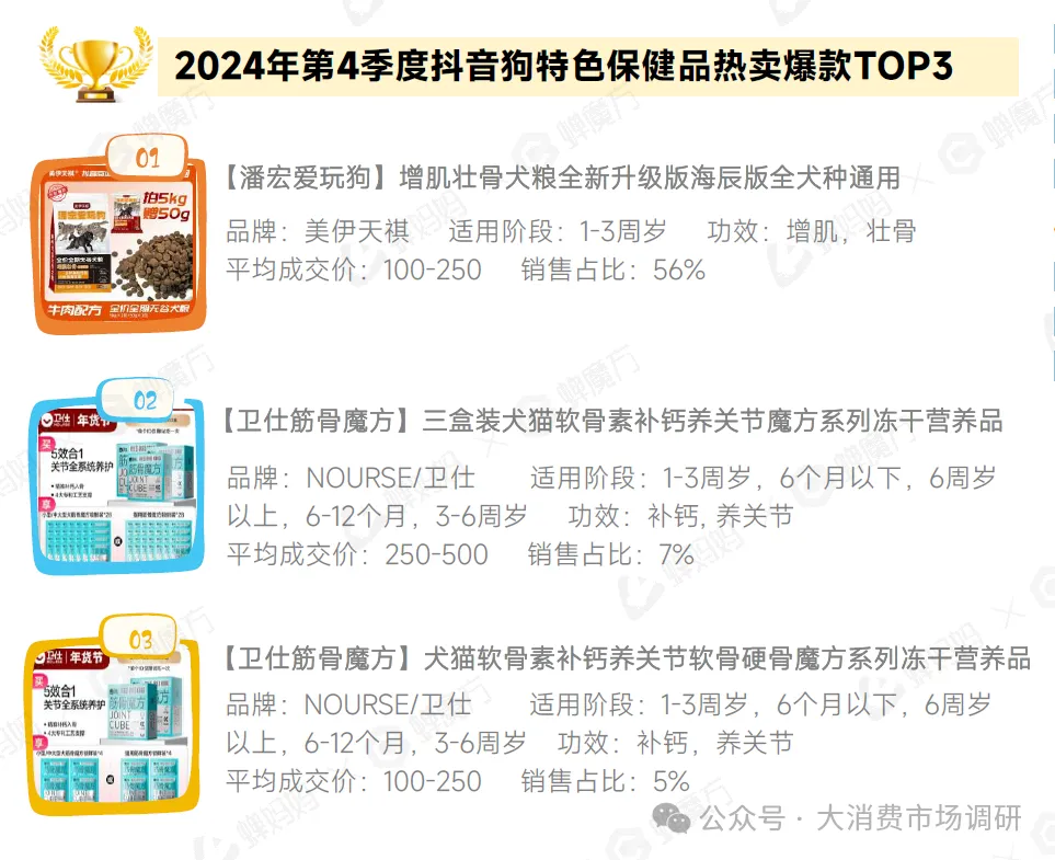 · 2024年第4季度,宠物保健品品类格局显著分化:狗类保健品强势增长、猫类保健品竞争加剧、通用产品稳定增长。 综合市场规模、同比增速、客单价,确定2024年宠物保健品市场的热门品类:“狗特色保健品”以最大市场份额、最快同比增速和最高客单价遥遥领先,说明该品类已占据宠物保健品市场的主导地位,宠物主需求快速增长,愿意为高端狗特色保健品买单,当之无愧为头号热门品类。 “猫狗通用营养膏”GMV略高于宠物保健品均值,但同比增速位居第三,表明仍在高速成长阶段。 宠物狗特色保健品 2024年,抖音平台上的狗特色保健品销售额呈现出波动增长态势,第4季度销售额爆发式增长,在12月达到全年销售额峰值,显示出年末平台促销活动、节日消费热潮以及宠物主消费升级带来的强劲购买力。销售额同比增速在年初高速增长后增速收窄,但GMV绝对值持续攀升,反映出该市场已向稳定增长模式过渡。 第4季度热卖爆款TOP3中, 冠军商品占据了一半以上的市场份额,功效为增肌、壮骨;GMV第2名和第3名商品实为不同包装规格的同一种商品,功效均为补钙、养关节。三盒装的大包装商品性价比更高,更受价格敏感用户的欢迎。 2024年第4季度,狗特色保健品市场向中高端拓展。100-150元区间表现最为突出,市场规模、销量及同比增速均远超其他价格带;150元以上区间虽然GMV和销量的增速相对较小,但位居第二的市场规模不容忽视;100-150元区间和150元以上区间商品数量增长较快,显示品牌正在加快布局高端市场,以迎合消费者对高品质产品的需求。而低价位市场虽然商品数量较多,但市场规模、销量和商品数量的增长已相对放缓,可能面临更激烈的竞争。 因此,品牌应倾向于中高端产品的开发,提升品牌的溢价能力,同时优化低价位产品,避免陷入价格战。 2024年第4季度,抖音平台上的狗特色保健品商品卡的获客能力持续稳定上升,成为最主要销售方式;直播GMV占比整体呈现下降趋势,季度贡献次于商品卡。直播在节点销售中具有爆发力,但消费热度较难持续。其中,直播带货的驱动力主要来自品牌自营号和达人合作号,反映出消费者对官方渠道的信任,KOL(关键意见领袖)推荐仍有较强的消费驱动力;视频GMV表现较为平淡。 值得注意的是,狗特色保健品销售方式的格局变化,不仅仅是消费者喜好转向直观便捷的商品卡,很大因素是潘*带货美伊天祺犬粮造成的。潘*的带货方式从最初的直播转变为商品卡为主、直播为辅,美伊天祺犬粮的市场份额超过狗特色保健品的50%。 2024年第4季度初期,抖音平台上的狗特色保健品GMV中,品牌自营号占据主导地位。10月底达人潘宏带货美伊天祺犬粮,依托美伊天祺犬粮的头部地位,带动达人合作号快速崛起,取代品牌自营号成为核心带货渠道,其中达人直播是最主要的销售驱动力,尤其是在大促期间,对冲动型消费者的吸引效果尤为显著。 因此,品牌应根据不同带货渠道的特点,优化资源配置,实现多渠道协同效应,提升整体销售表现。一方面,与达人深度合作,通过专属折扣、独家产品线或联合营销,提高达人直播的转化率,并探索利用短视频增加商品曝光度、增强消费者的产品认知。另一方面,借鉴达人合作号的互动方式,提高品牌自营号的带货能力。 梯队分布:带货达人基本按粉丝数量梯度分布,成金字塔型,尾部达人占据了绝大多数,其次是小达人。表明品牌主要依赖人数众多、推广成本较低的尾部达人和小达人,以触及更加细分的用户群体。 效能反转:头部达人和肩部达人没有带来高GMV,而是中腰部达人和小达人凭借较高的粉丝粘性和较强的专业性,贡献GMV最大。尾部达人虽然人数最多,但GMV贡献仅位居第三,人均带货能力有限。 未来,品牌可将拥有活跃粉丝群体和特定细分市场的中腰部达人和小达人作为重点合作对象,给予适当的政策倾斜,从而实现更高效的销售转化;继续扩大尾部达人的矩阵,以扩大市场覆盖面,起到广撒网式的引流作用。 2024年,狗特色保健品在抖音平台销售额呈现波动增长趋势,第4季度GMV明显回升,12月达到年度GMV峰值。 第4季度品牌竞争格局发生变化:100-150元区间的新入驻品牌美伊天祺表现抢眼,以56%的市场份额遥遥领先,与其同价位的NOURSE/卫仕GMV环比下降近三成,将头把交椅让位于美伊天祺。250-500元区间的IN-PLUS/麦德氏、100-250元区间的MAG市场份额不大,但GMV增长势头强劲。在0-50元区间的品牌众多,市场竞争更为激烈。凯瑟、新入驻的赋壮源取得了不错的成绩。 2024年第4季度,狗特色保健品在抖音平台上各价格带的品牌竞争格局存在显著差异:0-30元区间和30-60元区间的市场集中度较高,头部品牌占据绝对优势。但入市门槛低,造成品牌数量多,竞争激烈。新品牌需依托强渠道布局、低成本运营以及高性价比产品来吸引消费者,争抢市场份额。 60-100元区间的市场集中度最低,品牌数量较多,新品牌进入难度相对较高,需依托产品特色、营销策略的差异化来获取竞争优势。 100-150元区间和超过150元区间的市场集中度接近100%,品牌数量较少,竞争较小,适合新品牌入局。 性别分布:女性是主要消费群体,但男性消费者的目标群体指数(TGI指数)更高,对狗特色保健品的消费意愿更强,品牌可针对男性开发科技极简风产品。 年龄分布:24-30岁和31-40岁的年轻群体是主要消费群体。41-50岁以及50岁以上中老年群体虽然市场份额较小,但TGI指数较高,更