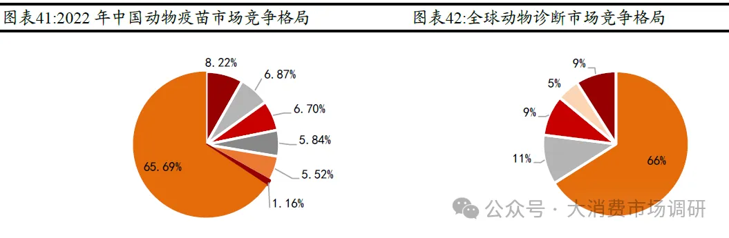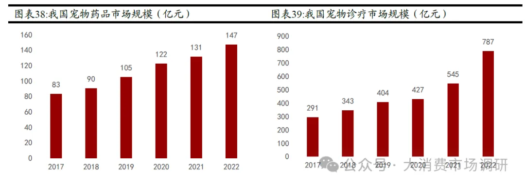 · 伴随宠物主养宠观念转变,宠物医药和诊疗市场规模快速提升。根据《2023中国宠物医疗行业白皮书》数据显示,2022年我国宠物药品市场规模147亿元,2017-2022年的CAGR为12.1%;2022年我国宠物医疗市场规模787亿元,2017-2022年的CAGR为22.0%。 我国宠物诊疗市场规模增速水平高于宠物主粮、宠物零食、宠物医药水平,属于宠物细分赛道中高景气度细分行业。随着宠物逐步向家人及伴侣的角色转变,养宠消费也逐渐向更高水平发展,新时代的宠物主基本都有定期体检、及时就医、打疫苗等医疗意识。此外,我国现存宠物大部分年龄偏低,2022-2026年将有大量宠物进入老年期(8岁以上),随着宠物年龄增长,宠物发病率会大幅增加,医疗需求提升将推动宠物医疗市场进一步增长。 宠物医疗行业产业链中占比最大的是宠物医院和宠物药品(包括疫苗)。宠物医疗产业链主要包括上游的药品疫苗、医疗设备、耗材,以及下游的宠物医院和第三方检测机构。 我国宠物药品及疫苗刚刚起步,动物保健公司过往产品主要面向经济型动物(猪、牛、鸡等养殖动物),目前正在加速布局宠物药品行业。宠物药品主要包括驱虫药、疫苗、皮肤药、抗炎药等产品。国内宠物医药市场目前是外资品牌如硕腾、爱德士等占据主导地位,国产品牌替代进展比较缓慢,产品以仿制为主,主打性价比优势。国内大型传统动保企业生物股份、中牧股份、科前生物、瑞普生物、普莱柯等当前都已在宠物板块有相应布局,产品线主要集中在疫苗及驱虫领域,其他还包括皮肤感染、耳道炎症、镇静药物等,随着国内大型动保企业在宠物医药领域的研发投入持续增加,以及产品迭代和创新,有望逐步推动宠物药品的国产替代。 宠物诊疗机构主要分为三类:1)小型宠物诊所模式。主要提供日常的宠物体检、疫苗注射、驱虫、绝育等,无法做复杂手术,对宠物医生要求相对没那么高,目前我国大部分宠物医院都是这种模式。2)大型全科宠物医院。除了常规的诊疗外,还提供专业科室,比如癌症、心脏病、外科手术等诊疗,具备大型专业医疗设备,启动资金较大,对医生专业要求也较高。随着宠物数量的增加以及宠物情感地位的提升,大型宠物医院会逐渐增多,其中新瑞鹏和瑞派两大龙头市占率遥遥领先,2022年市占率分别为9.4%和4.0%。3)第三方诊断实验室。独立的检测机构,客户主要为小型的宠物诊所。目前我国第三方诊断机构较少,处于刚起步阶段。 当前我国宠物医院的连锁化率还比较低,连锁化比例提升是未来发展趋势。目前我国宠物医疗机构连锁化率为21.3%,非连锁机构仍占据了主流。宠物连锁医疗机构具备规模效应、品牌效应、以及组织管理效应等优势,随着宠物医疗行业的快速发展,越来越多的资本介入这一领域,有望带来行业的整合和连锁化率的提升。
