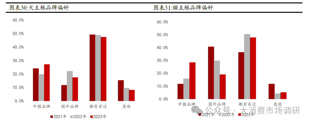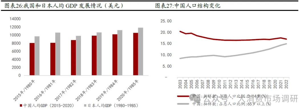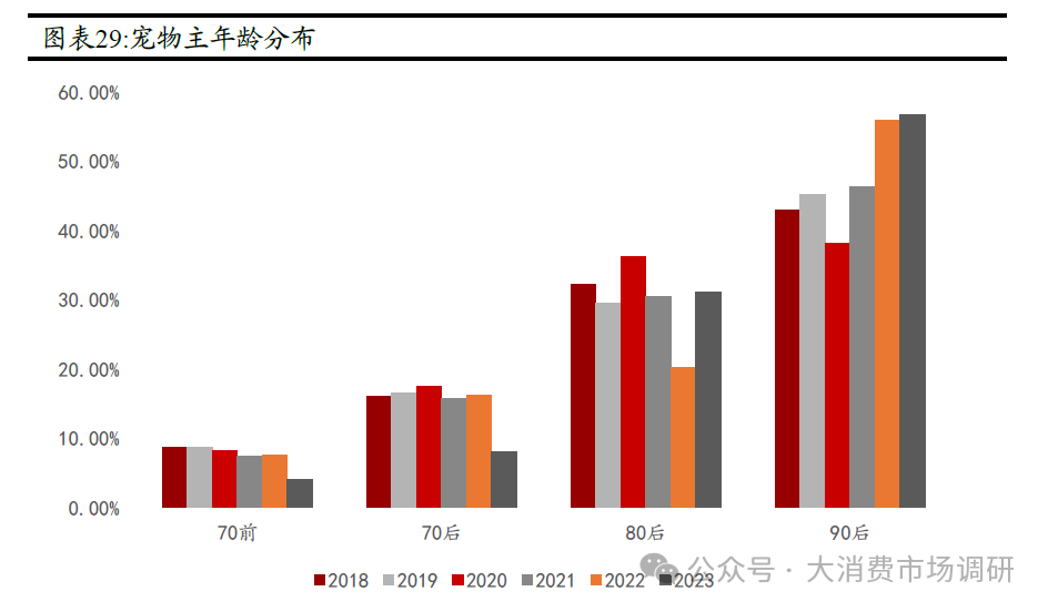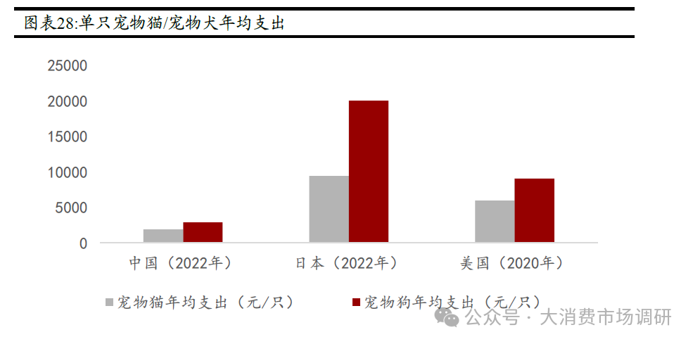 · 我国宠物行业当前发展阶段接近日本快速成长期阶段日本的宠物行业发展也大致经历了三个时期。日本宠物行业发展早期,养宠的主要人群经历了从中青年到老年的转变。从日本的宠物发展历史来看,日本宠物行业几次快速增长的原因依次来自于:1)70年代经济高速发达带来的丈夫工作繁忙,妻子出于陪伴需求开启了养宠流行的趋势;2)宠物角色向家人的转变;3)人口老龄化以及生育率降低。 ➢ 1970年以前,为行业的萌芽期。日本第一款自有品牌的狗粮Vita-one在1960年上市,日本宠物食品协会的前身日本宠物狗食品协会也在1969年成立。 ➢ 1970-2008年,为快速成长期。日本宠物市场在这一时期迎来了快速增长,1970年代,日本诞生了综合性的宠物店,宠物食品和宠物医院开始普及,具备了基本的养宠环境,再加上日本70年代处于经济高度繁荣时期,养狗成为潮流;1980年代时,迎来了从“看门狗”到家人的心态转变,从原本的熟人赠送到宠物店购买成为主流;1990年以后宠物美容店数量开始急剧增加,并出现了宠物大型专卖店连锁店铺。 ➢ 2009年至今,为成熟期。虽然宠物总体市场规模仍然在增加,但日本宠物(犬猫)的数量在2008年达到顶点后开始下降,日本政府也出台了诸多限制宠物销售的政策。 从中日两国的发展历史来看,中国宠物行业现阶段比较接近于日本快速成长期的发展状态: 1)从人均GDP来看,中国2019年起人均GDP超过1万美元,接近于日本1983年时的人均GDP,具备了宠物消费快速发展的经济基础。 2)日本的经验都证明了宠物食品行业是最先伴随宠物经济发展的细分行业,宠物食品的出现标志着宠物消费习惯培养的萌芽,自1993年第一款玛氏的狗粮进入中国,我国目前已经历了30年的宠物消费培育期。 3)过去二十年我国经历了人口结构逐步老化的过程,0-14岁人口比例从2003年的20.37%下降至2022年的16.96%,65岁以上人口比例从2003年的8.35%提高至2022年的14.88%。当前的人口年龄结构与日本1985年时候的人口结构相似,65岁以上的老年人口占比在10%以上,0-14岁的人口占比在18%以下,诸如老龄化、生育率低、孤独经济等趋势相似。 4)国内的宠物品牌目前较为分散,还未出现垄断性企业。日本在成长初期也是行业较为分散,但在这一时期出现很多后来成长为行业龙头的公司。 对标日本,老年人养宠将成为我国宠物市场未来新的驱动因素 与日本相比,我国宠物行业仍有较大的发展空间。根据《2022年中国宠物行业趋势洞察白皮书》,2022年我国宠物渗透率为20%,2021年与中国文化习惯和居住空间相似的邻国日本宠物渗透率为57%,大约是中国的3倍。日本是全球主要经济体中老龄化比例最高的国家之一。随着老龄化的进程,人们把宠物当作家庭成员的情感需求越来越强烈,越来越多的家庭选择饲养宠物,日本宠物产业的规模不断扩大。根据《2022年中国宠物行业白皮书》、日本Anicom保险公司、APPA统计,我国单只宠物犬年均支出2,882元、单只宠物猫年均支出1,883元,日本单只宠物犬年均支出34万日元(约合人民币2.0万元),单只宠物猫支出16万日元(约合人民币0.94万元),2020年美国单只宠物犬年均支出1,381美金(约合人民币9,033元),单只宠物猫年均支出908美金(约合人民币5,940元),我国单只宠物的年均支出仍有较大的上升空间。 我国现阶段宠物主多为年轻群体,未来老年人养宠将成为市场新的驱动因素。据《2023-2024年中国宠物行业白皮书》,我国养宠人群以80、90后为主,其中2023年的宠主中80后占比31.1%,90后占比56.7%。对比日本宠物发展历史来看,养宠的潮流是从陪伴的需求开始的,也是从中青年人慢慢转移到老年人养宠潮流的,现阶段我国年轻人饲养宠物的比例远大于老年人,这说明我国的养宠潮流还处于成长初期,潮流的发展阶段是慢慢从年轻群体向高年龄群体发展的,未来老年人饲养宠物的比例会大幅上升;2003年我国65岁以上老年人比例为8.35%,2022年我国的老年人占比已达到14.88%,随着人口老龄化程度不断加深,预计我国宠物市场还将继续大幅增长。 国内企业倾向从代工模式(OEM)转向自主品牌模式(OBM)。宠物行业发展前期,国内宠物消费市场主要由跨国企业占据,如玛氏、雀巢,国内企业普遍采取代工厂模式赚取较低利润。宠物行业进入高速发展期后,国内企业纷纷认识到宠物市场的蓝海,开始探索并建立自主品牌,向传统的跨国企业发起挑战,从代工厂模式到自主品牌模式的转型产生了一批颇具规模的自主品牌,如乖宝、顽皮、佩蒂等。从产品端看,国内企业开始了自下而上品牌发展路线,产品从低端细分市场开始,目前已部分涉及中高端市场。 国内宠物市场的发展空间广阔,龙头市占率仍然偏低,本土企业有望在激烈的品牌竞争中逐步站稳。同时,线上渠道的普及让国产品牌能以更低的成本扩张品牌知名度,企业纷纷成立起天猫、京东自营等网络渠道,以吸引年轻一代特别是90后的宠物主消费热情。展望未来,高端和超高端市场仍然被跨国品牌占据,但随着国产品牌认可度的提升和生产技术的完善,有望向该市场发起冲击。