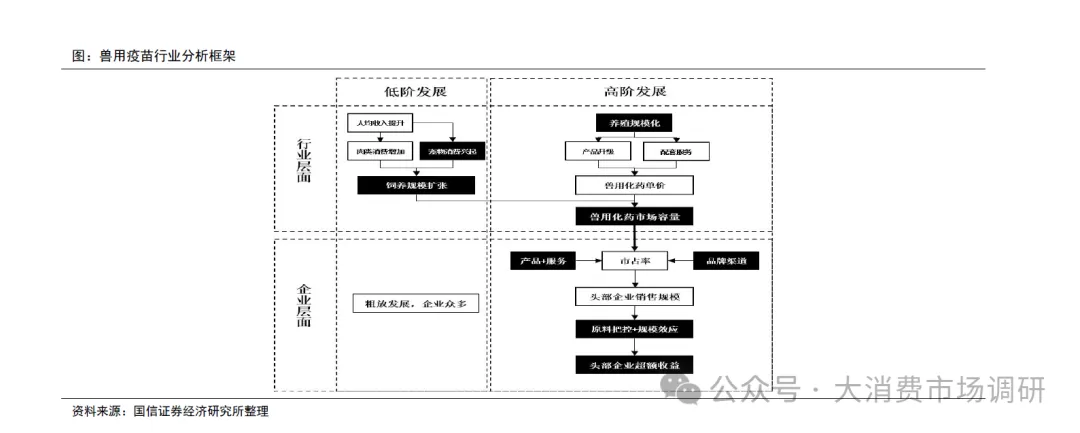 Ø 从企业层面来看,在产业粗放量增初期,企业数量相对较多,市场极不规范,整体格局分散。随着市场驱动由粗放量增转变为基于养殖规模化的结构升级后,规模企业在优质产品基础上更加重视品牌和服务,头部企业开始依靠产品矩阵、配套服务能力以及品牌渠道运作与规模养殖企业形成合作关系,市场份额逐步向头部企业聚拢,同时在制剂端壁垒相对较弱的情况下,基于原料把控和规模效应的成本优势也是头部企业获得超额收益的重要方式。