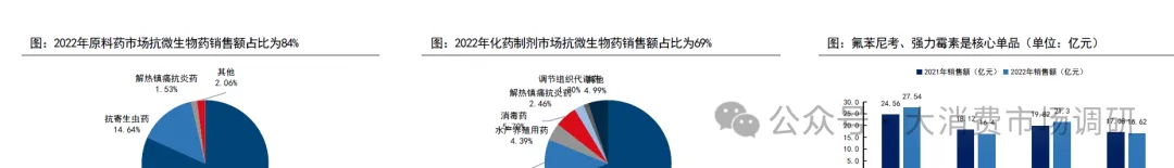 Ø 抗微生物药是国内兽用化药市场的核心构成,2022年国内兽用原料药市场和兽用化药制剂市场中抗微生物药的销售额占比分别为82%、69%。