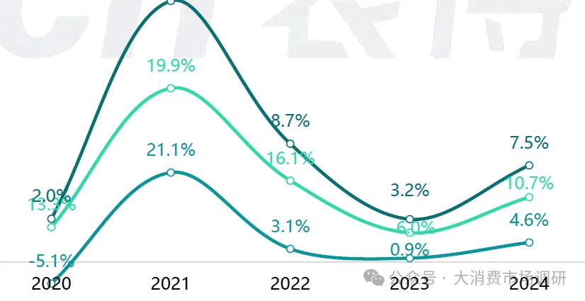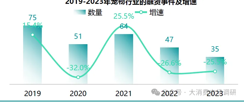 · 市场规模:稳中向好,2024年城镇(犬猫)消费市场规模突破3000亿 2024年城镇(犬猫)消费市场规模增长7.5%,达到3002亿元。其中,犬消费市场规模达到1557亿元,小幅增长4.6%;猫消费市场规模达到1445亿元,增长10.7% 2020-2024年中国宠物(犬猫)消费市场整体规模 城镇宠物(犬猫)同比增幅 宠物数量:2024年城镇宠物猫犬数量持续回升,宠物猫更受青睐 2024年,宠物数量为12411万只,较2023年增长2.1%。其中,宠物犬数量为5258万只,较2023年增长1.6%,宠物猫数量为7153万只,较2023年增长2.5% 行业渗透:宠物行业渗透率远低于海外,未来发展潜力有望进一步释放 2023年国内宠物犬家庭渗透率约为17.8%,猫家庭渗透率约为16.4%;中国宠物猫犬家庭渗透率相比于美国、日本等发达国家相比存在较大差距,未来潜在空间巨大 资本表现:一级市场进入融资寒冬,二级市场头部企业表现亮眼 2023年经营范围包含“宠物”的新增企业数量190家,由于2021年宠物融资出现“寒冬”,融资数量大幅度下滑;宠物经济指数稳压大盘,宠物经济指数成分股主营收入持续走高 消费结构:宠物市场消费结构稳定,细分市场小幅波动 宠物主粮、营养品、宠物寄养、宠物保险呈小幅度上涨趋势;宠物零食、宠物用品、宠物药品、宠物诊疗、宠物疫苗、洗澡美容呈轻微下降趋势;宠物体检、宠物训练表现平稳无波动