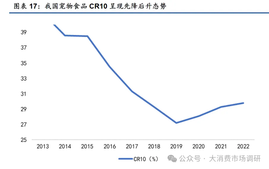 · 1、宠物食品赛道:流量变贵下,进入门槛加高,强营销转化率公司受益集中 过去,我国宠物食品赛道受益于资本端高热情、强大代工厂支撑及线上化转型加剧,“用钱换流量”的模式被打通,叠加过去大量新养宠人群进入市场,品牌认知较弱,催化大量新企业进入市场。宠物食品作为宠物赛道中规模最大、消费黏性最强的细分领域,受到资本端的大力追捧,2 021 年以前宠物食品的投融资数量及金额整体偏高,品牌端可以用于营销推广的资金充足,同时我国大量的代工厂商为品牌端提供强劲支撑,伴随我国电商平台发展的红利期,大量品牌通过线上流量实现品牌打造,市场上出现了很多快速兴起的新兴品牌,同时也快速淘汰了大量资金端无法支撑的品牌,品牌换血速度快。在新养宠群体为主的市场氛围中,品牌整体认知度较弱,营销端抓住消费者的眼球就存在成功的基因,因此催化了大量新企业进入市场,我国宠物食品赛道C R10 从2 013 年的41.5 下降至2 019 年的27.2 %%,市场进一步分散。 当前,一方面线上流量红利期接近尾声,流量变贵,另一方面,新进入的消费者增速下降,存量消费者向理性化进阶,如何守住成功成为关键。流量变贵的背景下,线上平台费用投放的费效比下降,打造品牌的困难加重,同时,行业内卷严重,价格端和配方端竞争激烈;资本端趋于冷静,投融资数量明显下降,整体投资集中在头部企业,因此中小企业的存活困难加剧。从消费者来看,近几年新增消费者数量下降,存量消费者的数量增多,存量消费者普遍有更强的品牌认知度和对宠物食品的知识储备,有更明确的评判标准,单纯通过概念的打造激活市场变得更难。总的来说,目前的困难已经逐步从如何获得成功转向如何守住成功,这对宠物食品企业有更高的要求,也使得行业新进入者明显下降,市场格局开始优化,C R10 从2 019 年的27.2 提升至2 022 年的2 9.8% 。 对比美日韩,我国宠物食品赛道市场格局分散,增长空间较大。从宠物食品公司的口径计算,据欧睿数据,我国头部宠物食品公司市场份额与美日韩相比均有2 倍以上的差距,在当前资本投资冷静、进入门槛提高以及头部企业收并购和持续营销下,市场份额有集中趋势。 从市场增速、消费渠道、客户结构等方面来看,我国宠物食品市场变化与韩国2 013 年开始的变化有相似之处。据韩国宠物食品协会,韩国年轻人养宠意愿强,这与我国情况相同;从消费渠道来看,韩国电商渠道发展较快,据欧睿2 022 年中国宠物食品线上销售渠道占比为6 6.1%6.1%,同时2 013 年 2022 年韩国宠物食品线上销售渠道占比分别为4 3.7%/68.9% 68.9%,线上均是宠物食品购买的主流渠道。因此从整体市场表现来看,我国宠物食品市场和韩国宠物食品市场有很强的可比性。 从市场增速来看,2 013 2017 年韩国宠物食品市场保持双位数增长,2 018 年后增速略有承压,2 020 年开始重回双位数增长区间,对标来看,我国当前正面临宠物食品市场规模增速的换挡期。因此我们认为2 013 年至2 018 年的韩国宠物食品龙三的演变格局更值得我们参考。据测算,2 013 2018 年韩国宠物食品赛道中龙1 龙2 龙3 企业的市场份额分别提升了3 .7/2.6/1.4 pctpct(其中龙2 数据缺失,我们按照均值进行线性外推),基于我国当前更分散的市场格局和更强的集中化推力,我们预测2 022 2026 年我国宠物食品公司龙1 龙2 龙3 市场份额分别提升4 .0/3.0/2.0 pct 至1 2.7%/7.8%/5.1% 5.1%,营收规模或将达到2 44/150/98 亿元,4 年C AGR19.58%/22.83%/23.20% 。 2、宠物医疗赛道:宠物医院和宠物药品双轮驱动,头部份额集中可期 宠物药品占据宠物医疗最大市场份额,宠物医院作为诊疗载体,承担重要职责。据弗若斯特沙利文,2 022 年宠物药品 宠物医院 其他分别占据宠物医疗赛道5 0.0%/28.0%/22.0% 的市场份额,其中宠物医院的市场占比相较于2 016 年提升了4 .64 pctpct,作为诊疗的重要载体,宠物医院承担了更重要的职责,宠物药品市场占比保持不变,疫苗、驱虫药等需求更偏刚性支撑。往后看,刚性支出支撑宠物药品市场,预计市场份额仍保持在5 0%0%,市场规模达5 94 亿元,4 年C AGR10.84%AGR10.84%,宠物医院受益于宠物老龄化加剧对宠物诊疗的需求提升,预计带动宠物医院占比在2 026 年提升至2 9.8 pctpct,市场规模达到3 54 亿元,4 年C AGR 1 2.57% 。 资本端重仓,收并购多现,催化行业成熟,但整体市场格局仍然分散,以中小个 体户为主。2 015 年后,高瓴资本等机构重仓宠物医疗领域,催化了行业的加速成熟,2 015 年宠物医疗新成立公司也达到高点,年新增2 2 家公司,此后受创业高门槛、资金集中推力的影响,创业热情下降,2 020 2022 年在该领域没有新增公司,相反,行业龙头收并购多现,新瑞鵬2 015 2020 年间,收购了安安宠医、芭比堂动物医院等多家医院,至2 021 年,新瑞鵬在全球已经拥有1 600 多家门店。但从整体市场分布来看,单体医院占据重要市场份额,据2 022 年中国宠物医疗白皮书显示,1 家 2 5 家5 家以上宠物医院的市场占比分别为4 9.9%/28.9%/21.2% 21.2%,分散化仍然明显。 利润端出现分化,资本趋于冷静,资金向头部品牌集中,中小企业受制于资金端压力或将加速出清。进入2 022 年,整体资本端偏冷的情况下,宠物医院的被投资标的主要集中在了新瑞鵬集团、瑞派宠物医院、瑞辰宠物医院和萌兽医馆等连锁宠物医院,在当前近4 0% 的宠物医院亏损或持平的背景下,中小企业受制于资金端的压力或将加速出清。 头部企业集中度