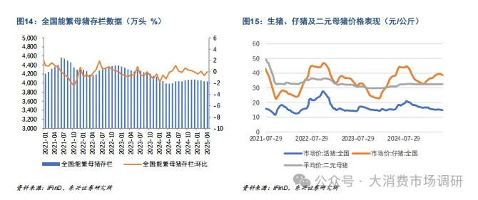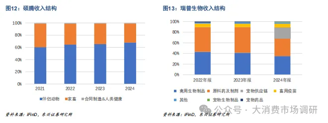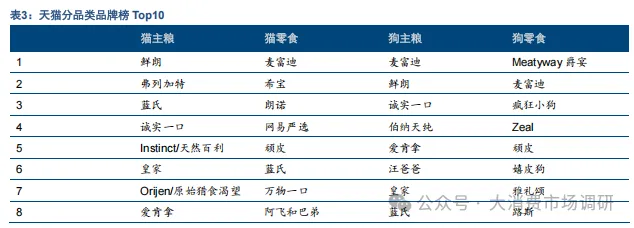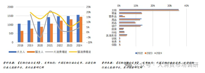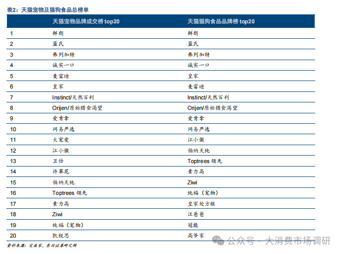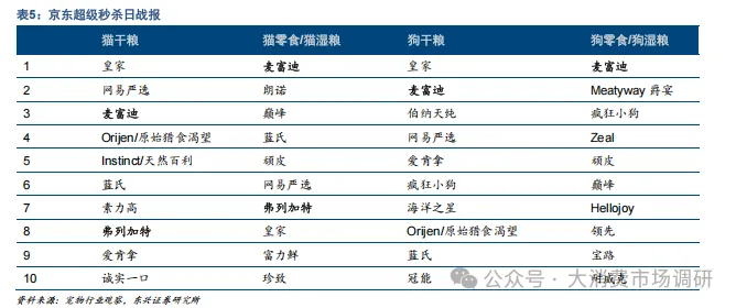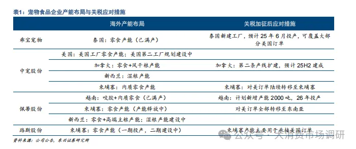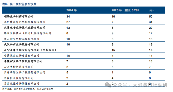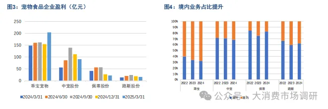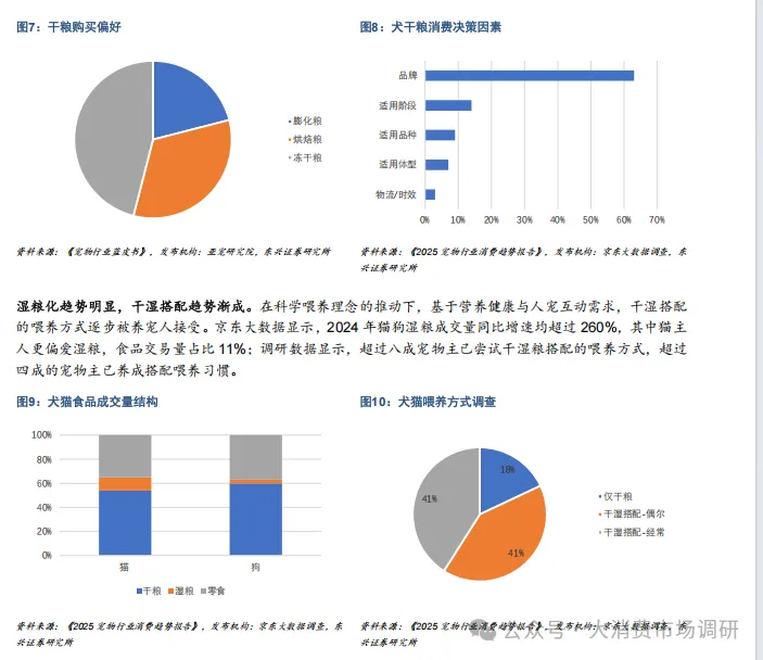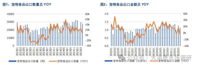 · 1.1 宠物食品:出口业务受关税扰动,国内自主品牌增长强劲 宠物企业出口业务持续稳健增长。海关总署出口数据显示,25 年宠物食品出口数量和金额在 24 年高基数下持续稳健增长。25 年 1-4 月,宠物食品出口数量累计达到 11.02 万吨,同比增长 16.17%;出口金额 4.54 亿美元,同比增 6.06% 5 年关税扰动,产能出海规避风险。2018 年美国对原产我国的宠物食品加征 10%的关税,2019 年进一步提升至 25%。2025 开年以来中美贸易经历了关税层层升级最终缓和,自 5 月 14 日起,双方保留 10%的基 础关税,叠加 2-3 月美 18-19 年关税加征之后,宠物食品企业以收购或自建的方式在海外进行产能布局,但仍有一部分对美直接出口业务受到冲击,对 25Q1 订单落地造成了阶段性扰动。各家企业已经在积极在海外扩产,转移对美订单,预计影响整体可控。此外,各家企业持续拓展国内自有品牌业务及非美地区出口业务,抗风险能力增强 我国宠物市场维持稳健增长,主粮和营养品占比提升。2024 年宠物行业白皮书数据显示,城镇宠物(犬猫)消费市场规模突破 3000 亿元,较 2023 年增长 7.5%,其中,犬用消费市场规模增长 4.6%,猫用市场规模增速较快,同比增长 10.7%,猫用产品持续带动消费增长。从消费结构来看,食品作为刚需消费仍占据最大比重,市场份额 52.8%,其中主粮和营养品占比小幅上升。 新型主粮接受度高,专宠专用趋势明显。随着宠物拟人化趋势持续,宠物主对于宠物的健康管理越发重视,营养成分丰富,鲜肉含量更高的烘焙粮、冻干粮等产品获得消费者青睐。并且根据亚宠研究院调查显示,消费者可以接受烘焙粮和冻干粮的合理溢价,45%左右的犬主人和 86%的猫主人可以接受 30-50 元/斤的价格区间。此外,除品牌之外,专宠专用成为消费者选择干粮产品时重要的决策因素。根据京东大数据调查,2024年老年犬粮销售额同比增长 67%,销量及热度增速明显 18 开场,宠物消费强劲增长。电商平台 618 购物节已于 5 月中旬陆续开启,大促时间进一步拉长,各大平台推出多元化的让利补贴方式吸引消费者。宠物类目在本次 618 大促中持续表现出强劲的增长动力,以天猫为例,5 月 16 日开卖的 100 分钟成交额超过去年首日全天。 国产品牌强势崛起。国产品牌逐渐取代海外品牌,成为市场主流,618 抢先购天猫宠物品牌成交榜前五位分别是鲜朗、蓝氏、弗列加特、诚实一口和麦富迪,全部为国产品牌,乖宝集团一己之力拿下两席。国产品牌增速迅猛,天猫开卖首小时,弗列加特、蓝氏、鲜朗等 9 个宠物品牌跻身千万俱乐部;开卖 4 小时,金故、许翠花(+530%)、MEATYWAY(+450%)、Toptrees(+250%)、鲜朗成交增幅领跑全行业 从宠物食品的细分品类来看,乖宝集团旗下品牌麦富迪在猫零食、狗主粮品牌榜单中居于首位,在狗零食、猫零食品牌榜中位居第二位和第十位,弗列加特跃升至猫主粮品牌榜单第二名。中宠和佩蒂以宠物零食见长,佩蒂旗下爵宴品牌晋升狗零食领域第一名,中宠旗下三大品牌:顽皮在猫零食、狗零食品牌榜单中均列第五名;领先在狗零食品牌榜单中排名第九位;Zeal 在狗零食品牌榜中位列第四名 风干/烘焙粮和主食湿粮是近几年的热门品类,上市企业在热门品类中重点发力。乖宝集团旗下的弗列加特在猫用风干/烘焙粮和主食湿粮领域位列第一;中宠旗下领先品牌在猫狗用风干/烘焙粮领域均进入榜单前五;佩蒂旗下爵宴品牌风干粮在狗全价风干/烘焙粮领域位列第五。 东渠道对海外品牌偏好略强。在京东 5 月 16 日开启的超级秒杀日中,皇家在猫狗干粮领域位居第一,京东渠道表现优于淘天平台;以鲜朗为代表的部分国货品牌在淘天平台榜单排名居前,而在京东平台未上榜,显示出淘天平台是国货品牌、新品牌竞争的主战场,而京东平台用户对海外品牌偏好略强。从上市公司表现来看,乖宝旗下麦富迪和弗列加特多点开花;中宠和佩蒂则保持了在犬猫零食领域的传统优势 我们认为,宠物食品出口业务面临关税扰动,有望通过将对美订单转移至东南亚来降低影响。国内宠物消费稳步增长,健康化、专宠专用、干湿搭配等消费趋势持续深化,国产品牌已逐步占据消费者心智,成为消费主流,市占率和盈利能力有望持续提升。我们持续看好宠物食品行业的发展韧性和增长潜力,推荐关注中宠股份、佩蒂股份,其他相关标的宠物食品龙头乖宝宠物。 .2 宠物动保:猫三联密集上市,进口替代逐步展开 宠物医药市场空间广阔。我国宠物老龄化趋势将逐步显现,2024 年 7 岁以上老年犬占比 23%,相比 23 年提升 5%,老年猫占比 11%,相比 23 年提升 8%,宠物年龄增长会带来医药需求提升。根据宠物行业白皮书数据测算,2024 年我国宠物诊疗、药品和疫苗市场规模分别为 378.25 亿元、291.19 亿元和 75.05 亿元,3 年复合增速分别为 1.3%、9.1%和 5.0%。我国宠物医药市场空间有望随着养宠高峰推移持续扩张 宠物动保起步期,收入结构待升级。我国宠物药物疫苗市场长期被海外厂商硕腾、勃林格、礼蓝等厂商占据。我国动保企业多年来主要以经营经济动物产品为主,收入结构和产品结构亟待升级。以全球最大的动保企业硕腾为例,24 年其收入中的 67.8%由伴侣动物产品贡献。瑞普生物是我国宠物产品发展较为领先的企业,其收入中宠物药品和疫苗合计占比仅为 1.84%,未来增长空间极大。从我国动保行业发展方向来看,从传统疫苗到多联多价、mRNA 等新型疫苗,从经济动
