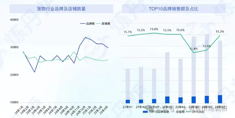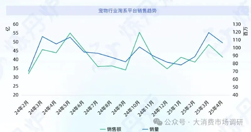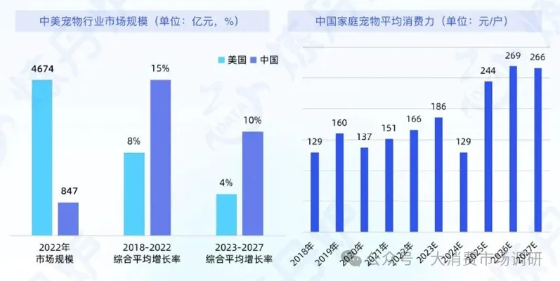 · 宠物赛道稳健扩容,精细化养宠趋势加速 数据显示,中国宠物行业市场规模在2022年达到847亿元,预计2023至2027年将以10%的综合平均增长率稳健扩容。同时,中国家庭宠物平均消费力也呈现出逐年增长的趋势,从2018年的129元/户增长至2022年的166元/户,并预计在2027年达到266元/户。这些数据表明,随着人们生活水平的提高和对宠物情感需求的增加,精细化养宠趋势正在加速发展。 宠物行业线上市场规模稳定,整体趋势向好 宠物行业线上市场规模稳定,2024年2月-2025年4月期间,销售额与销量整体波动处于合理区间,显示出市场韧性。随着养宠家庭增多、宠物消费意愿提升,线上购物凭借便捷性优势,持续吸引消费者,这将支撑宠物行业线上市场规模稳定增长,未来有望借助电商新营销模式、新消费场景等进一步拓展市场空间。 入局品牌持续增多,市场竞争向多元化转变 自2024年1月起,宠物行业品牌数整体呈波动上升态势,不断有新品牌入局,反映出行业吸引力增强,市场参与主体愈发丰富。而TOP10品牌销售额占总销售额比重在2023年上半年出现下滑,虽之后有回升但未达前期高位,说明行业集中度趋于下沉,头部品牌市场份额受到一定程度挤压,市场竞争正从头部集中向多元化竞争转变。 养猫群体快速扩张,猫主人消费意愿提升显著 2024年城镇宠物猫数量达7153万只,高于宠物犬的5258万只,且猫数量同比增速2.5%也高于犬的1.6%,反映出养猫群体扩张更快。消费金额上,宠物犬单只年均2961元高于宠物猫的2020元,但猫的消费金额同比增速5.2%高于犬的3.0%,说明猫主人消费意愿提升更显著。 养宠消费升级,中高端价格带市场份额逐步上升 2023-2024年,宠物行业中20元以下及20-50元价格带销量同比下滑,而100-300元价格带销量同比增速达24.43%,300-500元、500元以上价格带分别以9.15%、44.75%的增速上扬。在各品类价格带销量分布上,中高端价格带的占比也逐渐扩大。这表明消费者不再只关注低价产品,而是更愿意为品质、服务买单,中高端价格带市场份额正稳步提升。 女性为主要养宠物人群,养宠城市加速下沉 从性别分布来看,女性一直是养宠的主要力量,2022年和2024年的数据均表明女性养宠人数远超男性,不过男性的养宠比例在逐步上升。在城市分布上,养宠趋势加速下沉。2022年,养宠人群在一线城市占比最高,但到2024年,二线、三线城市的养宠人群增长迅速,三线城市甚至有赶超一线城市的态势,四线、五线城市的养宠人群也有所增加,这反映出随着生活水平的提高和消费观念的转变,宠物陪伴的需求逐渐从大城市向中小城市延伸,宠物行业在低线城市的市场潜力正被不断挖掘。