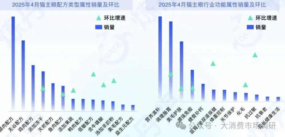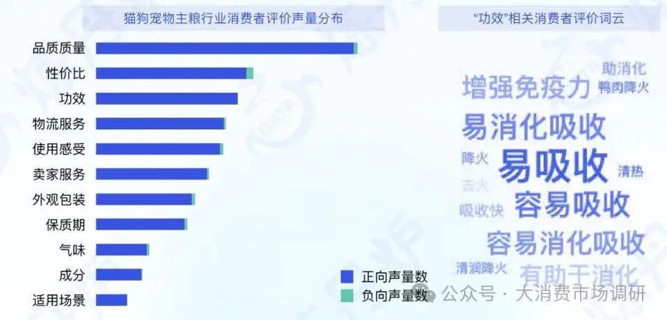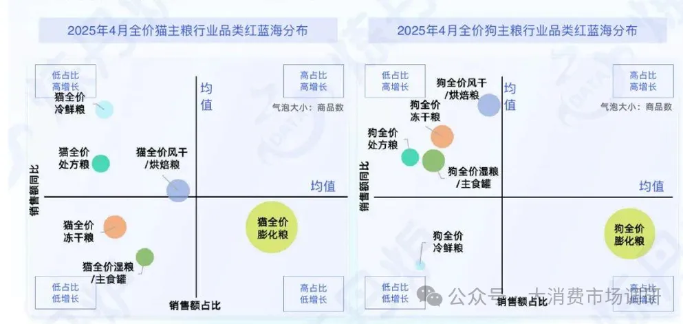 · 从2025年4月全价猫犬主粮行业品类红蓝海分布看:猫主粮中,猫全价膨化粮虽销售额占比高,但增长低;而猫全价冷鲜粮等低占比品类却高增长,反映出宠主对新鲜、优质食材的追求。狗主粮方面,狗全价风干/烘焙粮、冻干粮等新兴品类增速较快,狗全价膨化粮则是高占比低增长。这表明消费者不再满足于基础的膨化粮,对富含营养、工艺先进的高端细分品类需求渐长,推动宠物食品行业不断创新升级。 品质、性价比与功效是宠物主购买宠物食品的决策因素 从消费者评价声量分布能清晰看出,品质、性价比与功效在宠物主购买宠物食品决策中占据关键地位。品质是基石,宠物主关注原料来源、生产工艺等,期望为宠物提供安全健康的食品,高正向声量体现对品质的严格要求。性价比考量则源于理性消费,宠物主既追求优质,也在意价格合理性。功效方面,“易吸收”“增强免疫力”等诉求突出,表明宠物主重视食品对宠物健康的积极作用。 猫主粮配方与功能多元,需求升级;抗过敏、益肾功能增速显著 配方中,鲜肉配方销量居首,无谷、鸡肉配方受宠,特色配方如添加冻干、鱼肉配方等呈环比增长。功能方面,营养滋补功能销量领先,满足猫咪基础营养需求;调理肠胃、美毛护肤功能受关注,对应猫咪常见健康问题;益肾、抗过敏功能环比增长显著。整体来看,猫主粮市场既重视基础需求满足,也朝着多元化、特色化方向发展,以契合不断升级的养宠需求。 鲜朗以“新鲜”为品牌核心价值主张 技术、原料、运输为“新鲜”背书,销量稳定上升鲜朗2014年入局宠物行业,因洞察肉粉品控难,弃肉粉、用鲜肉研发0肉粉粮。2017年打磨鲜肉烘焙工艺,以“好原料筑健康”为理念,凭品质站稳市场。其以“新鲜”为核心,低温烘焙实现0肉粉,93%动物性原料。产品酥脆肉香、无油无色素。供应链上,农场直供、冷链运输、自有工厂,选优质肉源,为宠物提供新鲜优质烘焙粮 鲜朗全价格带覆盖,实现拉新、留存、复购闭环 鲜朗构建分层产品矩阵,策略清晰:低价段主打“试吃拉新”,借小规格、低成本让消费者尝鲜,拓展新客;50-100元布局主食罐、冻干等,“正装拉新”深化体验;100-300元单包干粮正装为“核心价格段”,承载品牌盈利与口碑;>300元干粮囤货装,用于“复购+老客沉淀”,通过全价格带覆盖,实现拉新、留存、复购闭环。
