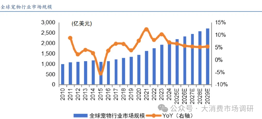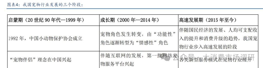 · 从全球范围看,根据Euromonitor数据,2024年全球宠物行业的市场规模约为2,070亿美元,预计2029年全球宠物行业的市场规模将达到2,708亿美元,2024-2029年复合年增长率预计将达到 5.5%。 美国是全球宠物经济第一大国,其宠物行业的专业性、产业链完整性遥遥领先于其他各国。根据 APPA(美国宠物产品协会)披露,2024年美国宠物行业的市场规模约为1,519亿美元,其中宠物食品规模约为658亿美元,占宠物行业总体规模的 43%。 欧洲是全球另一大宠物消费市场,市场规模则呈现稳定增长趋势,宠物产品销售额逐年扩大。根据FEDIAF发布的数据,2023年欧洲宠物市场消费总额达538亿欧元,其中宠物食品销售规模达到292亿欧元。 相较于发达国家,我国宠物行业兴起较晚,于20世纪90年代初起步,大致经历了启蒙期、成长期和高速发展期三个阶段。 据《2025年中国宠物行业白皮书》数据,2024年我国宠物犬数量为5,258万只,较2023年增长1.6%,宠物猫数量为7,153万只,较2023年增长2.5%,犬猫数量实现“双升”。