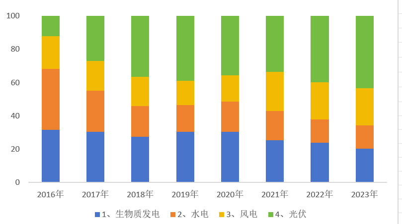 安徽省历年可再生能源发电量结构图(生物质发电+水电+风电+光伏发电)