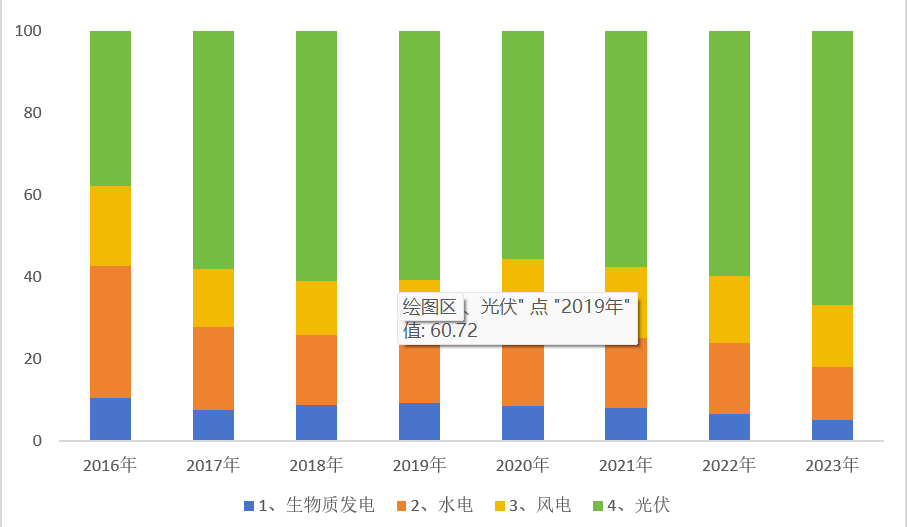 安徽省历年可再生能源发电装机容量结构图(生物质发电+水电+风电+光伏发电)
