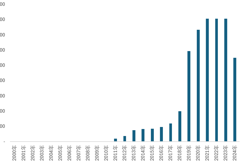 全球各国光伏发电:2000-2024年乌克兰历年光伏发电装机容量规模走势