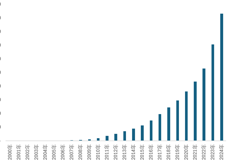 2000-2024年全球历年光伏发电装机容量规模走势