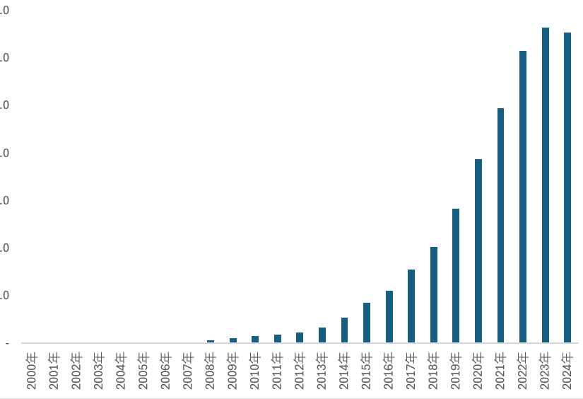 2000-2024年历年光伏发电装机容量规模走势