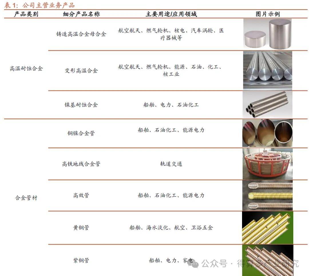公司主营业务由合金管材、高温耐蚀合金等构成。公司合金管材业务产品主要有铜镍合金管、高铁地线合金管、高效管、黄铜管、紫铜管,主要用于船舶、石油化工、电力、轨道交通和制冷等领域。公司高温合金业务包括铸造高温合金和变形高温合金,下游领域应用广泛,包括航空航天、能源电力、油气石化、船舶、汽车等行业,铸造高温合金专注“两机领域”(特指应用在上述相关行业中的航空发动机和燃气轮机设备),包括民用和军用。