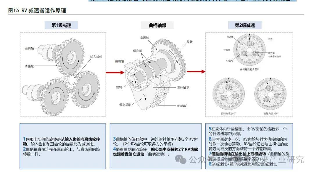 RV 减速器(Rotary Vector,旋转矢量)是一种精密的机械传动装置,最早由日本发明,用于实现高扭矩输出和高精度的旋转运动,通常适用于工业机器人基座、大臂、肩部等重负载的位置。