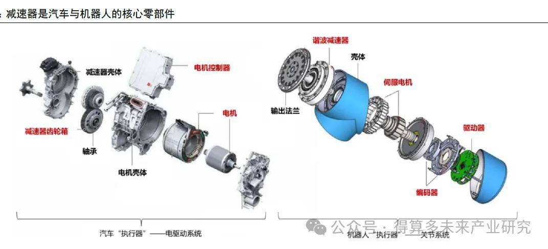 减速器在汽车端和人形机器人端均有应用,人形机器人为减速器厂商带来产业升级机遇。汽车的电驱动系统和人形机器人的旋转关节系统均采用减速器来降低电机转速、提高输出扭矩。机器人与汽车减速器在原材料、设计、工艺、设备、装配,以及成本管控能力、产品质量管控能力体系等方面具有一定相通性,在汽车领域具有相关产品、技术储备的公司,有望将产品从车端向人形机器人端延伸,实现产业升级。
