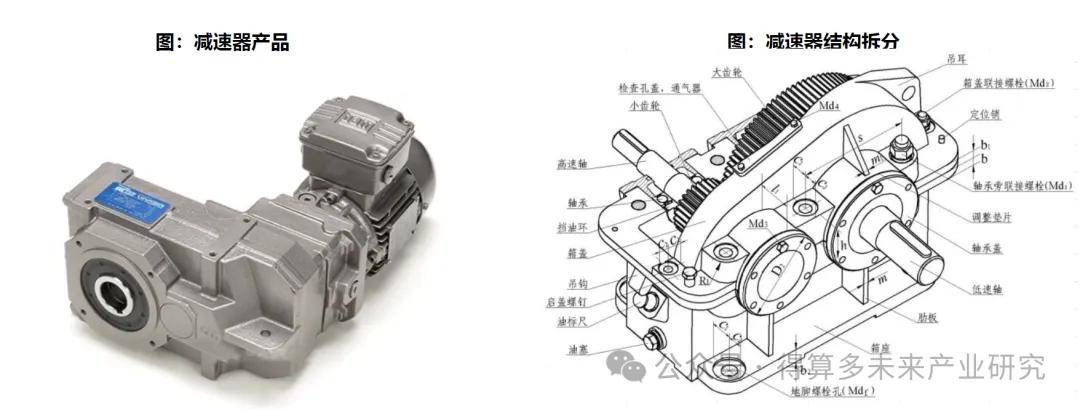 ◼ 减速器是由多个齿轮组成的常用传动零部件,内部结构复杂,其通过不同大小齿轮的啮合传递动力。在一般的机械设备中,由电机带动设备运转,但电机额定转速不能得到完全使用,需要通过减速器降低转速增加扭矩;因此我们可以类比在人形机器人中,减速器主要将伺服电机的动力传导至各执行结构如关节处,降低转速并增加扭矩,以精确控制机器人动作。