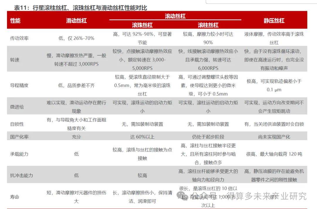 滚珠丝杠与行星滚柱丝杠结构类似,以滚珠而非滚柱作为传动部件,主要性能区别在于:1)承载能力与寿命。行星滚柱丝杠能够提供高于滚柱丝杠的额定动载和静载,静载为滚珠丝杠的3倍;2)速度与加速度。行星滚柱丝杠旋转速度和加速度更高;3)导程。行星滚柱丝杠导程和节距呈函数关系,可以设计计算为整数或小数。滚珠丝杠导程受到滚珠直径限制,是标准的;4)刚度及强度。行星滚柱丝杠具有众多接触点,能够大幅度提高刚度与抗冲击能力。