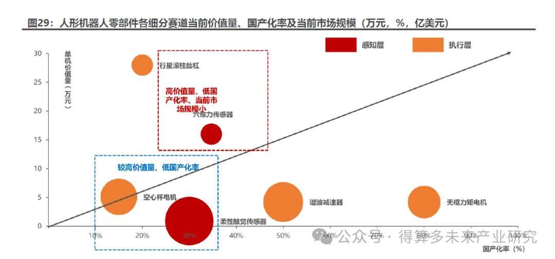 综合价值量、国产化率及市场规模三维度,建议重点关注:1)行星滚柱丝杠,技术壁垒高且国产替代空间大;2)六维力传感器,人形机器人核心增量部件;3)空心杯电机,灵巧手核心驱动单元;4)MEMS触觉传感器,柔性化趋势下的技术升级方向。当前细分赛道普遍呈现低渗透率、高成长性特征,具备产业链卡位优势的企业有望率先受益于人形机器人产业化放量。