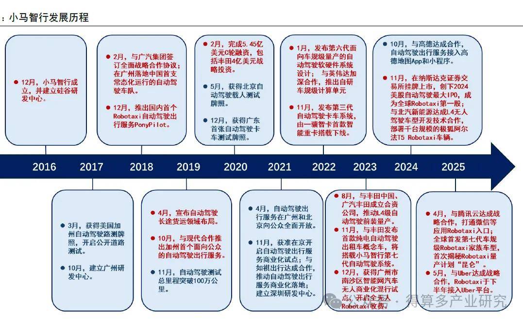 1)2016 年,小马智行成立:2016 年,小马智行联合创始人楼天城(公司CTO 首席技术官,首届清华姚班,Waymo 无人车的技术开发,百度无人驾驶事业部技术委员会主席)、彭军(公司CEO,清华大学本科、斯坦福大学博士毕业,百度自动驾驶首席架构师)从百度离职、联手创业,吸收顶尖人才成立团队,包括邀请楼天城在清华就读期间的导师姚期智院士担任首席顾问,2016 年12 月,自动驾驶公司小马智行(Pony.ai)诞生于美国加州,成立硅谷研发中心。
