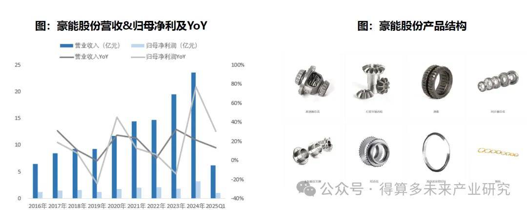◼ 2024扭亏为盈,2025Q1业绩实现延续。公司产品涵盖动力传动总成、传动零部件(变速器总成等)、压铸产品及触摸屏、触控显示一体化。2024年公司营收达35.36亿元,同比+25.9%;归母净利润为1.24亿元(2023年亏损为3.65亿元)。2025Q1营收达8.13亿元,同比+8.1%;归母净利润达0.52亿元,同比+45.9%。