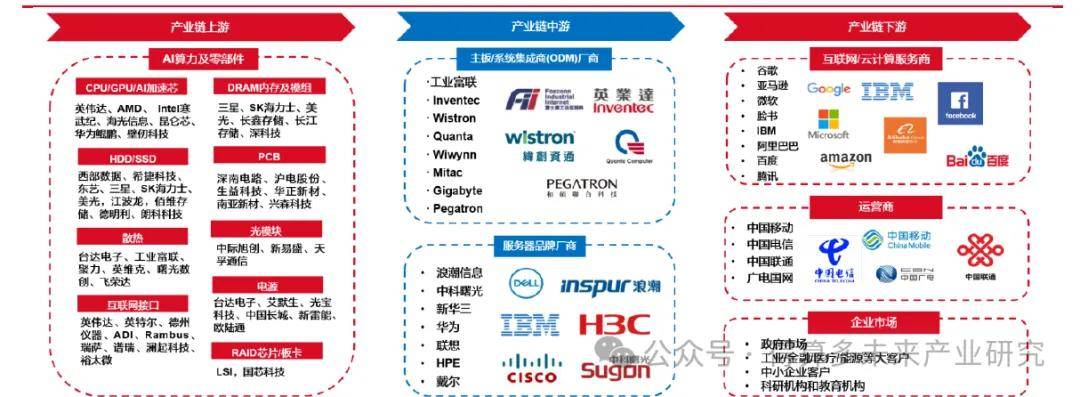 (7)AI服务器是大模型算力之源,AI服务器通过集成GPU、FPGA等加速器,能够大幅提升计算速度,满足AI模型对大规模数据处理的需求。国内相关重点厂商包括浪潮信息、工业富联、紫光股份等,服务器其中一个分支是液冷服务器,国内相关厂商包括中石科技、光迅科技、川环科技、国芯科技等。
