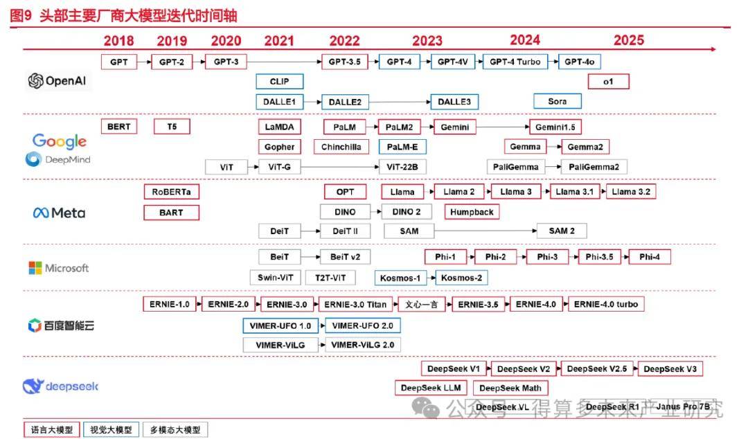 (2)按照输入数据类型的不同,大模型可分为大语言模型、视觉大模型、多模态大模型三大类;从训练范式看,大模型也可分为基座模型、推理模型和多模态模型。1)从输入数据类型看,大语言模型(LLM,Large Language Model)是指在自然语言处理(Natural Language Processing,NLP)领域中的一类大模型,通常用于处理文本数据和理解自然语言,它们在大规模语料库上进行了训练,以学习自然语言的各种语法、语义和语境规则;视觉大模型是指在计算机视觉(Computer Vision,CV)领域中使用的大模型,通常用于图像处理和分析,这类模型通过在大规模图像数据上进行训练以实现各种视觉任务,如图像分类、目标检测、人脸识别等;多模态大模型(MLLM,Multimodal LLM)是指能够处理多种不同类型数据的大模型,例如文本、图像、音频等多模态数据,这类模型结合了NLP和CV的能力,以实现对多模态信息的综合理解和分析,能更全面地理解和处理复杂的数据。2)从训练范式看,除去上文提到的多模态模型,基座模型(Foundation Models)是一种大规模的预训练模型,通常用于提供基础的语言理解和生成能力,特点是参数数量庞大,能够处理复杂的语言任务;推理模型(Inference Models)是在基座模型的基础上进行进一步训练和优化的模型,它专注于提升模型的推理能力,通常通过强化学习等技术来增强模型的性能,能够处理更复杂的任务,具备自主规划和决策的能力。