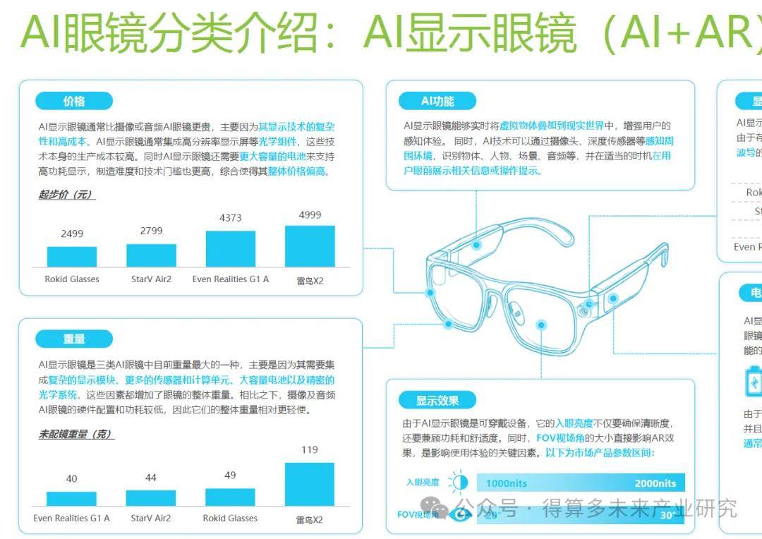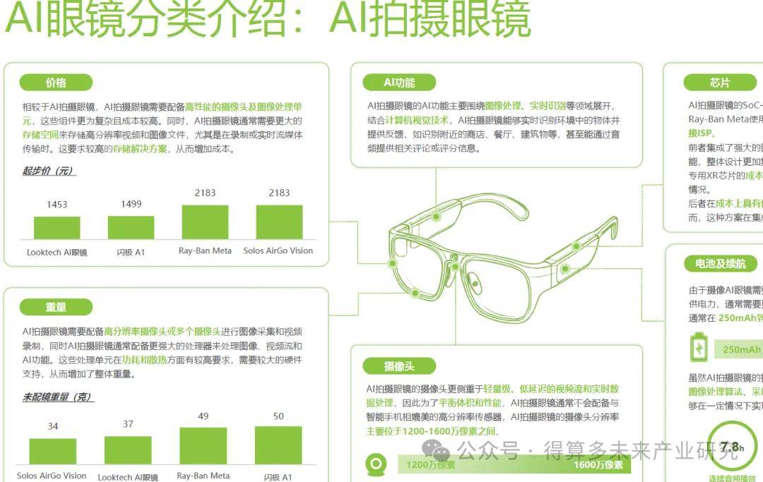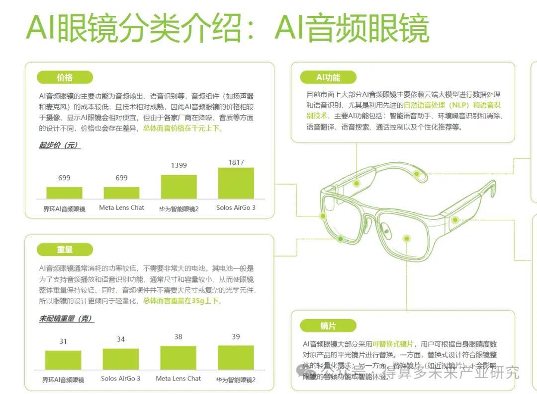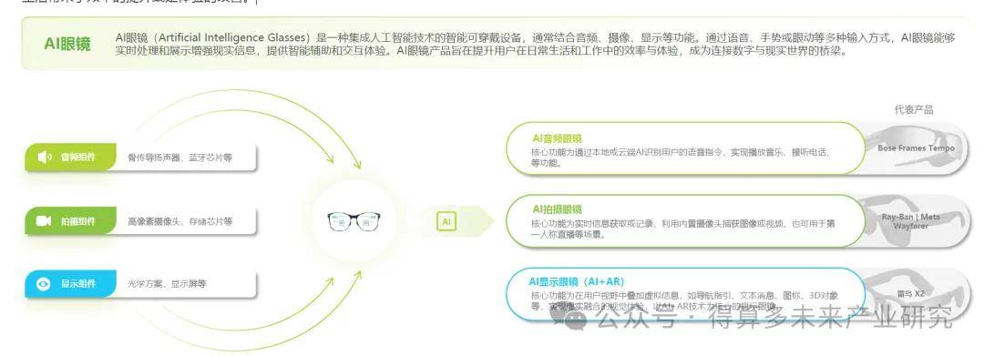 AI眼镜是一种创新型可穿戴设备,其在传统眼镜产品的基础上增加了人工智能技术,并将音频、摄像等功能集成于一体而成。对于AI眼镜而言,人工智能属性是其最核心的属性。在此基础上,根据集成的技术或硬件类型又可以细分为五大类型,每种类型的适用场景、适用人群存在一定差异性,但共同点在于AI眼镜为用户的工作、生活带来了效率的提升或是体验的改善。