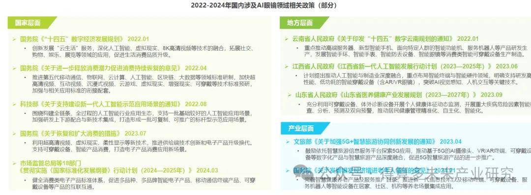虽然国内尚未出台专门的AI眼镜行业政策,但多项涉及人工智能、可穿戴设备、科技创新、产业协同发展的相关政策对AI眼镜行业的发展具有重要影响。国家层面上,人工智能、可穿戴智能设备领域相关政策密集出台,一方面侧重人工智能的技术创新,另一方面依托可穿戴智能设备拉动国内居民消费。地方层面来看,可穿戴智能设备是各省市的政策关注重点。另外,医疗、文旅等产业相关政策也频频提及人工智能、可穿戴设备等领域,突出产业协同发展。
