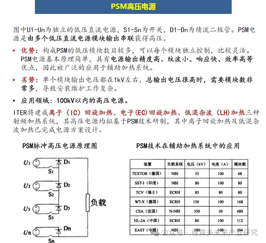 杂波(LH)加热。每种射频加热系统向等离子体输送功率将达到20MW,而要求其高压电源的功率达到50MW。PSM电源需要大量低压直流电源模块串联以获得高压输出。