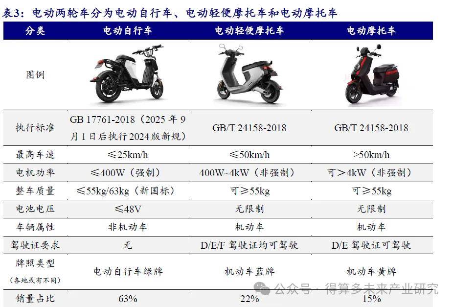 电动两轮车以电动自行车为主,以蓄电池作为辅助能源。电动两轮车分为电动自行车、电动轻便摩托车、电动摩托车, 其中电动自行车为市场主流, 2024年销量占比达 63%,高于电轻摩 /电摩托的 22%和 15%。 按定义,电动自行车是 以蓄电池作为辅助能源 ,具有两个车轮,能实现人力骑行、电动或电助动功能的特种自行车。