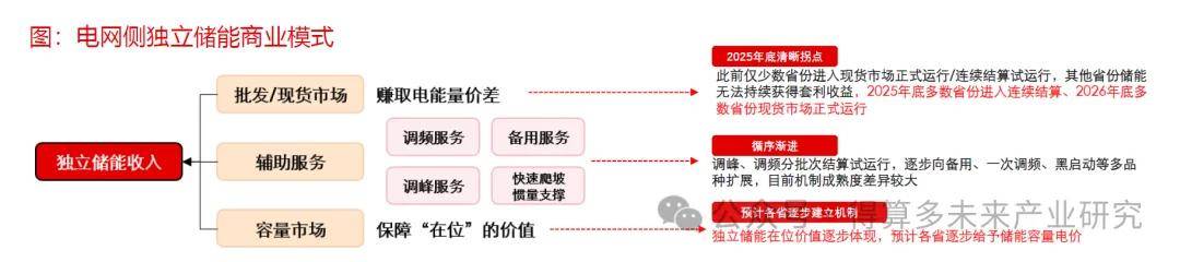 目前,独立储能商业模式包括现货市场充放套利、辅助服务(调频/调峰/备用/惯量支撑)、容量补偿/容量租赁等,目前海外如英国、美国、澳洲等海外市场体系也较为成熟,国内各省亦依托电力市场改革加速机制完善,机制已经逐步脱虚向实,其中现货市场以2025年底为拐点较为清晰,容量电价作为保障收益已在陆续出台,辅助服务循序渐进、多数地区尚处于分批结算试运行阶段。