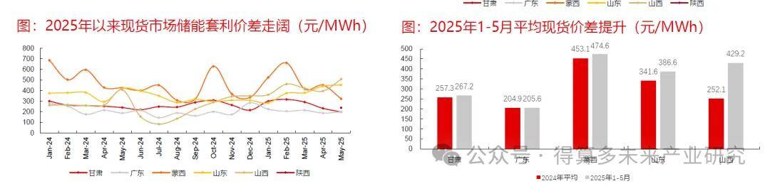 另外,随新能源市场化比例提升,现货市场价差有望进一步扩大。2025年1-5月甘肃、广东、蒙西、山东、山西5个进入现货市场的省份,现货市场价差均同比扩大,其中蒙西、山西平均现货价差达到0.4元/kWh以上。在政策上,2025年5月山东发改委印发《山东省新能源上网电价市场化改革实施方案(征求意见稿)》提出适当放开现货市场限价,拉大充放电价差;内蒙亦有相关政策出台,现货市场价差有望进一步扩大。