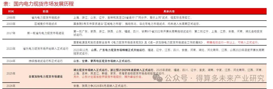 国内电力现货市场发展历经多阶段探索,2025-2026进入全面加快建设阶段。1998 年启动省内试点但未实质落地,2003 年推进区域试点亦未长期运营;2017 年开启新一轮省内建设,经多年试运行,2023-2024年山西、广东、山东、甘肃、蒙西地区现货市场陆续转入正式运行。2025年4月,国家发改委、能源局联合发布《关于全面加快电力现货市场建设工作的通知》,标志着国内电力市场改革进入新阶段,明确要求大部分省份2025年底前启动现货市场连续结算试运行,按照《电力现货市场基本规则》连续运行一年以上可转入正式运行,因此2026年国内大部分省份将实现现货市场正式运行。连续结算试运行后,储能将可持续参与现货市场套利。